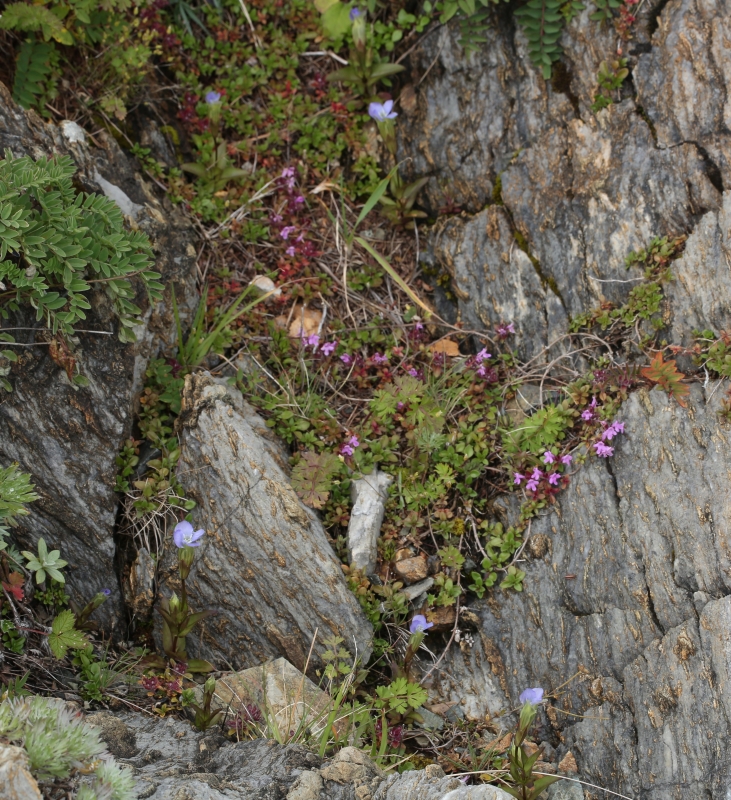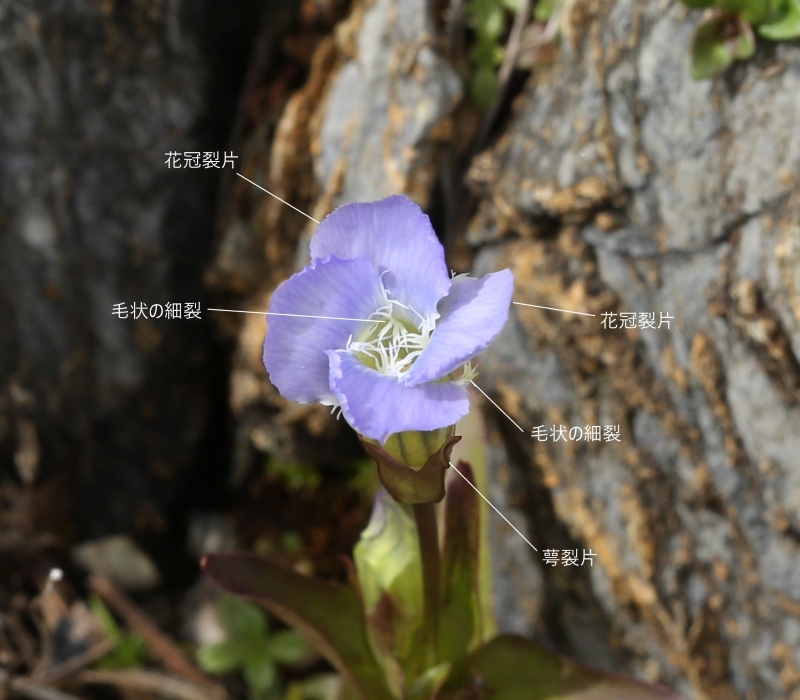 標高3000mほどの日当たりの良い岩稜の礫地に生育していた。長い花柄の先に淡紫色の4個の裂片に分かれた花を咲かしている。