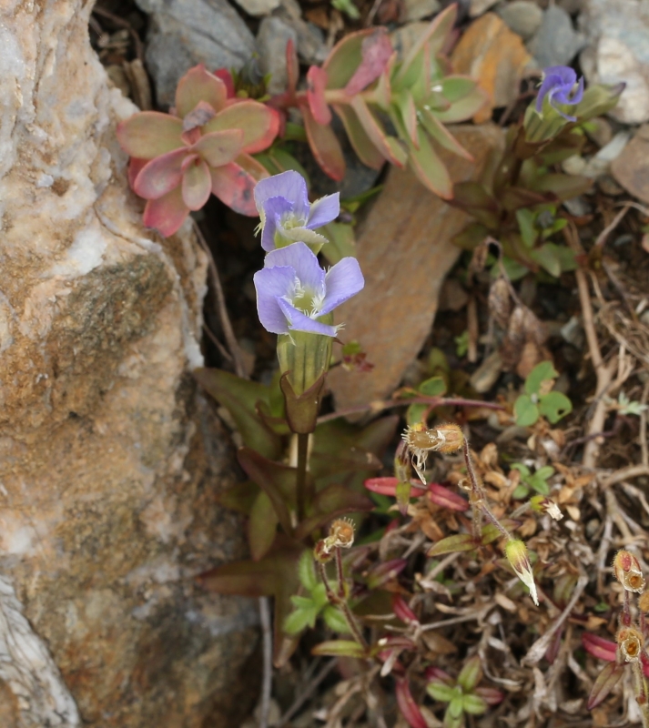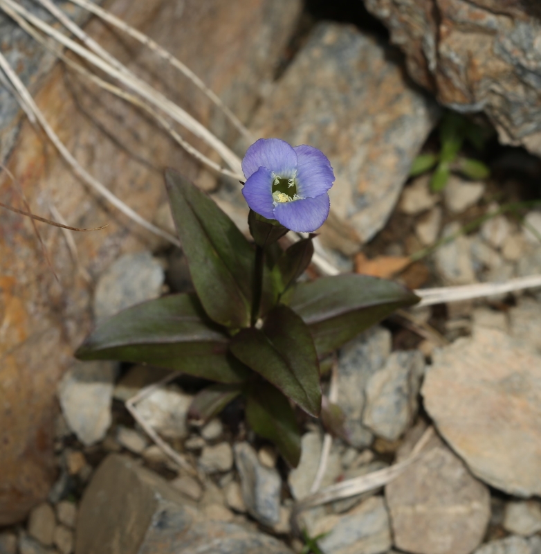 ふつうのアカイシリンドウの花は淡紫色であるが、この個体は濃い紫色の花で、葉や茎も全体に紫褐色を帯び草体も5cmほどで小さい。