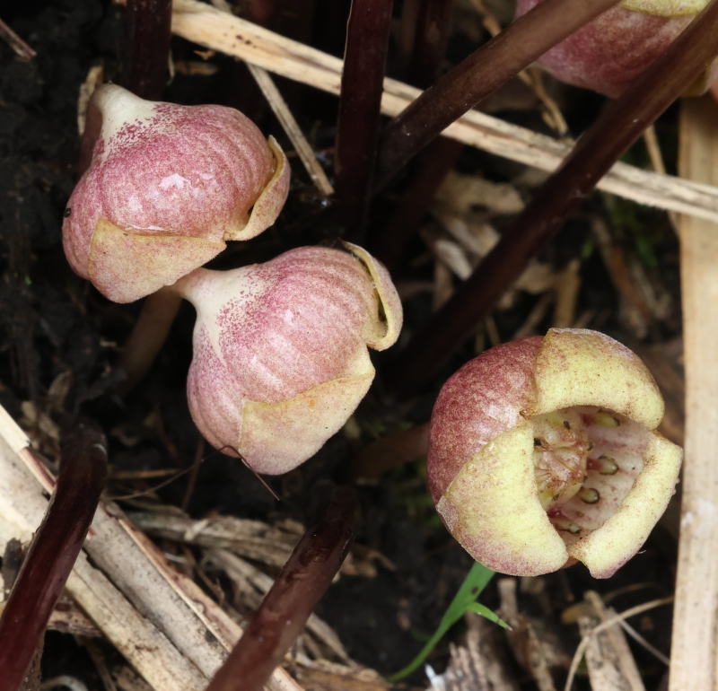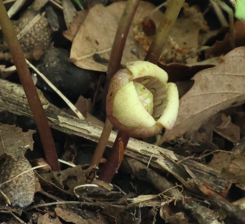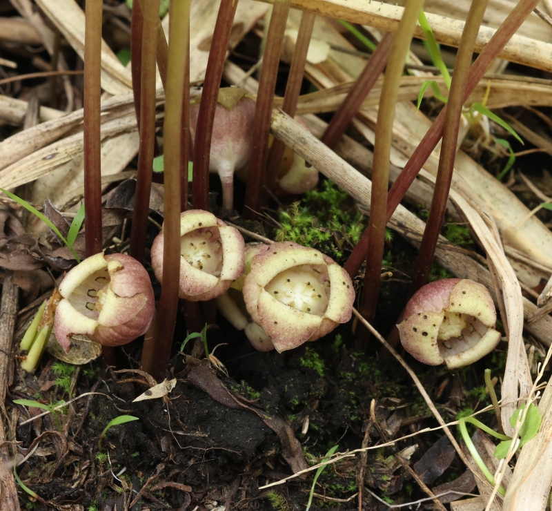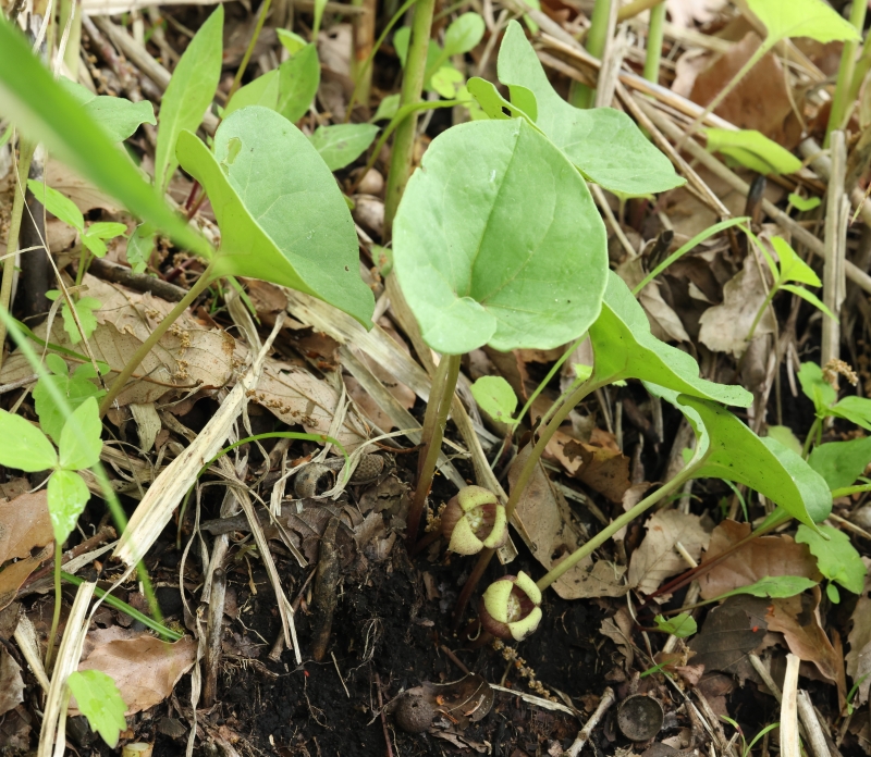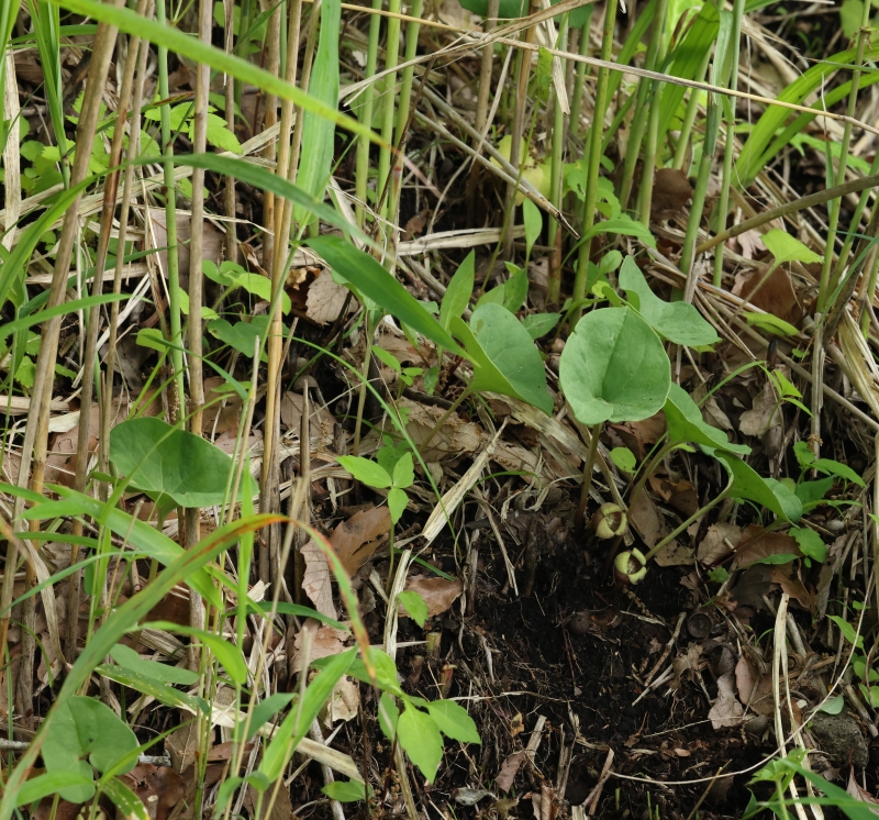 雑感:ウスバサイシン節のウスバサイシンやクロフネサイシンが湿気の多い渓流沿いを好んで生育するのに対して、やや湿った環境ではあるがススキやササが生えるような丘陵地の下部の草原に生育しているのには驚かされた。生育地の範囲は狭いが繁殖力が強いのか、幼苗が多数見られたのはよかったが、あらためて阿蘇外輪山の特異性を再認識するとともに、草原を維持するための山焼きや草刈りなどの必要性を感じた。