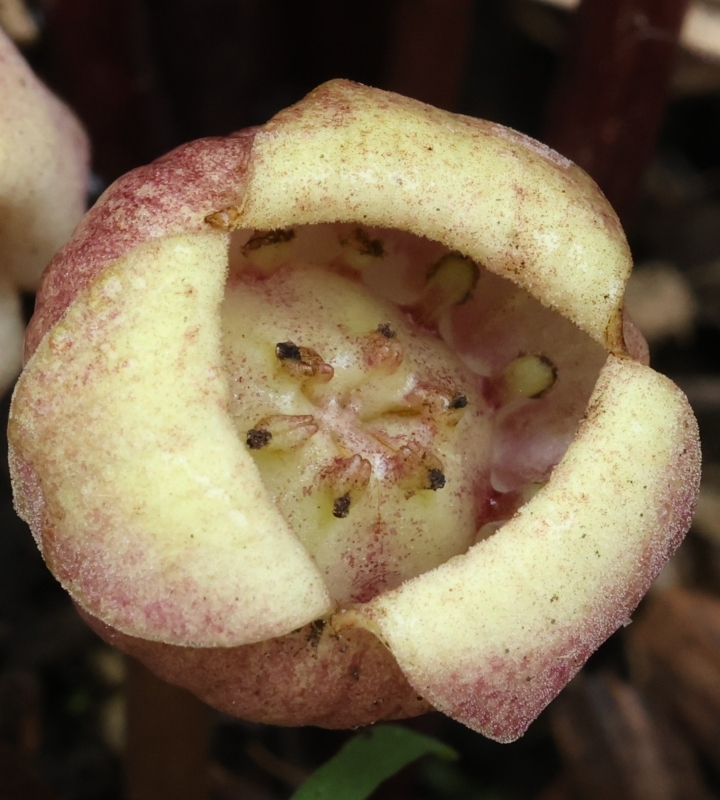 萼裂片は3個、3角形で強く反り返り萼筒に密着する。萼筒内部には縦に低く隆起した襞がある。花柱6個、雄しべ12個。