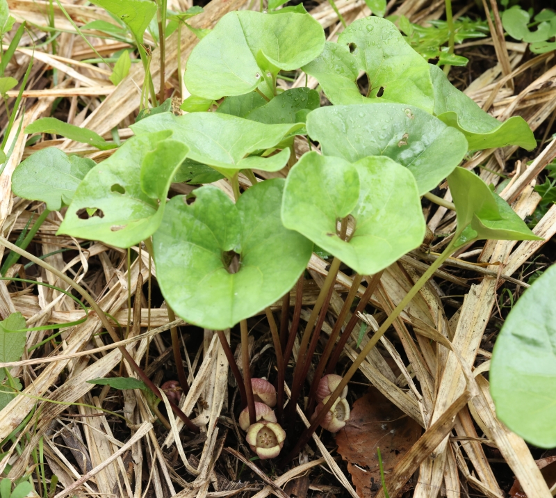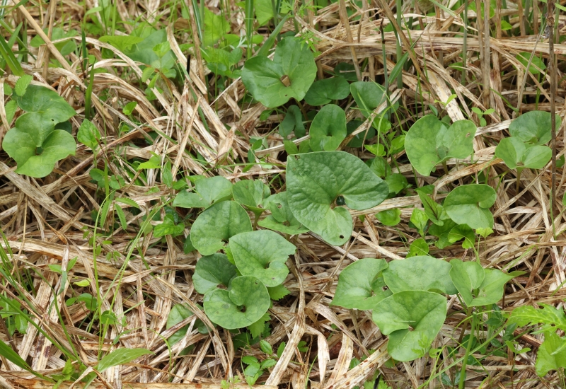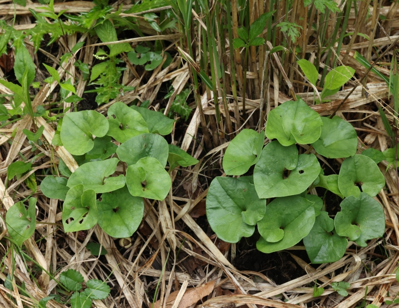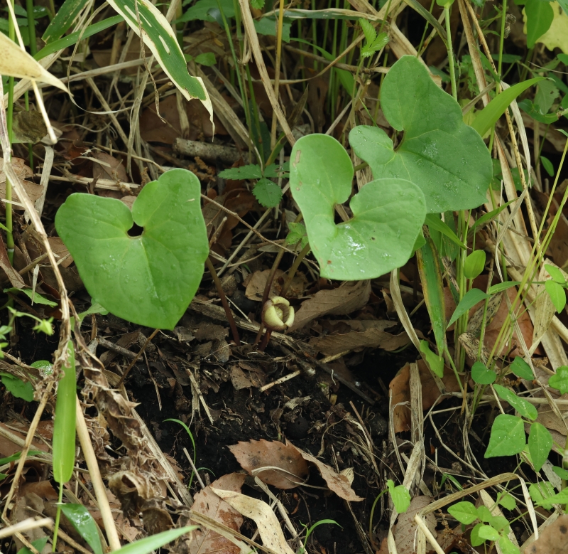 葉は卵形、長さ5~10cm、幅4~8cm、基部はハート形、先端は少しとがる。葉の下の花はススキの枯葉の下に隠れて見えない。