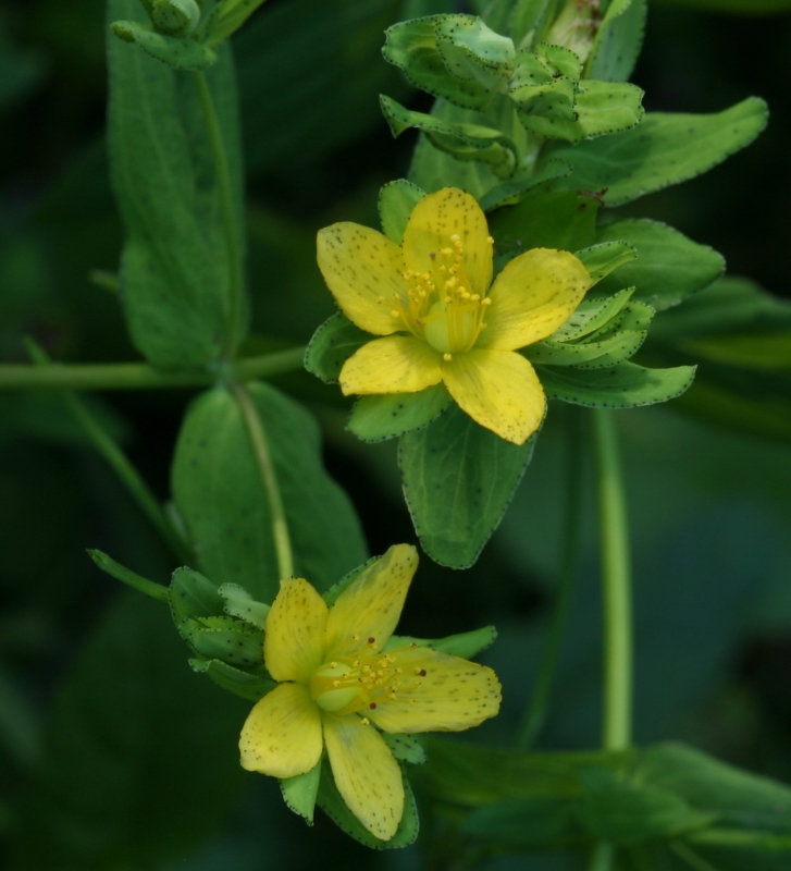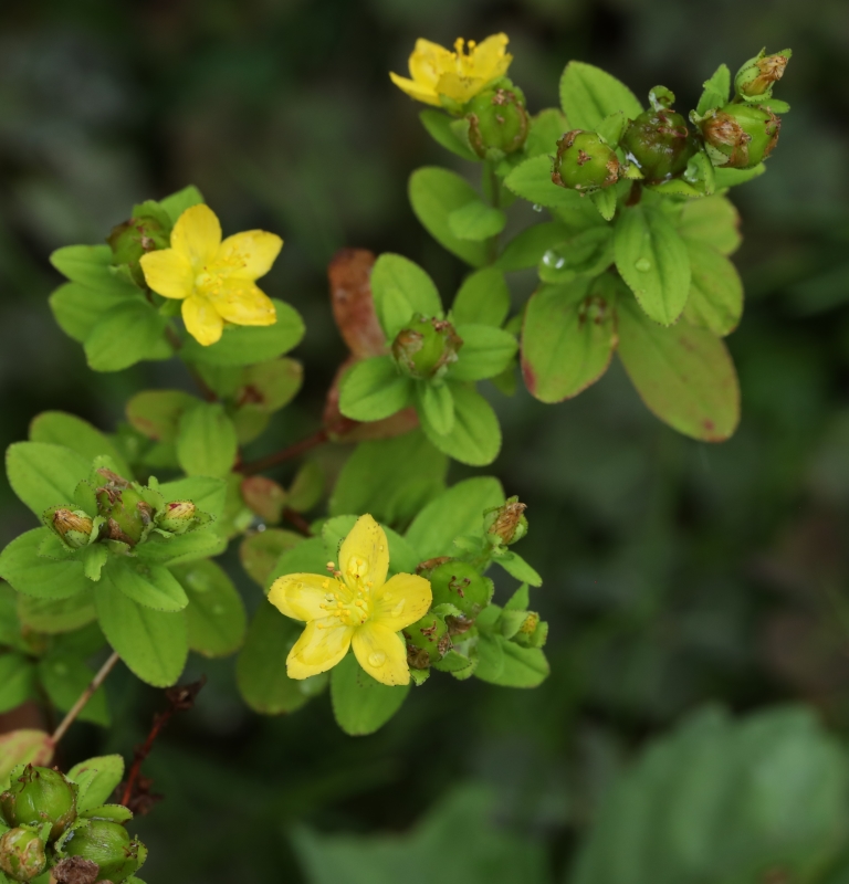 典型的なアゼオトギリの花。花弁に黒点が多数見られ、萼片の縁や葉縁にも黒点があり、花柄は花に比べて長いのが分かる。花、葉、萼などに入る黒点の密度は