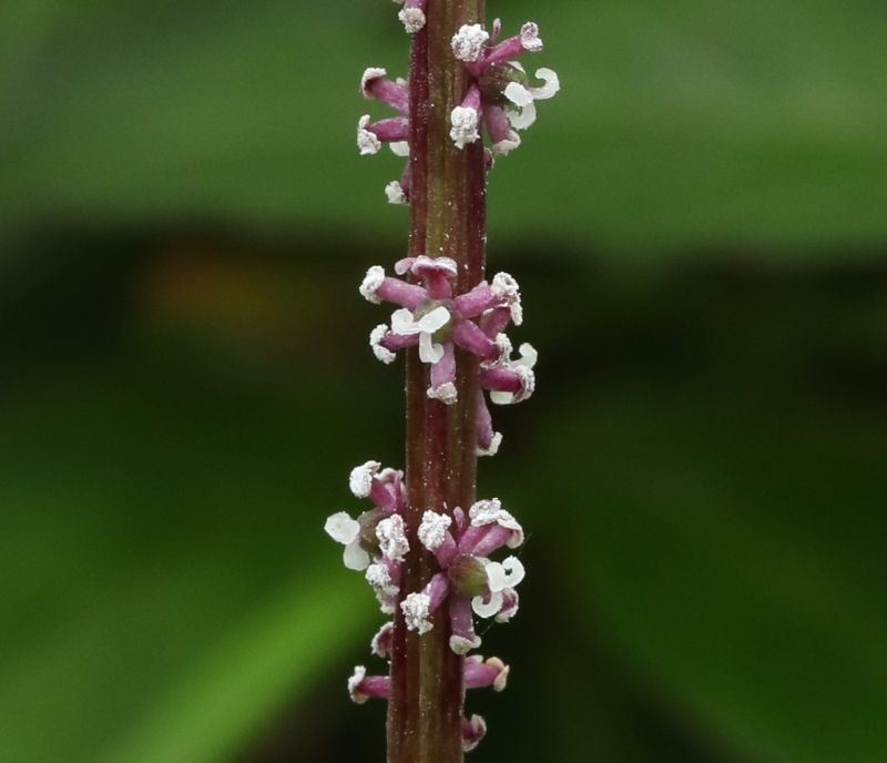 13個ほどの花序が赤紫色の個体があるが、いずれも開花状態でありながら花被片は見られず、退化していると考えられる。