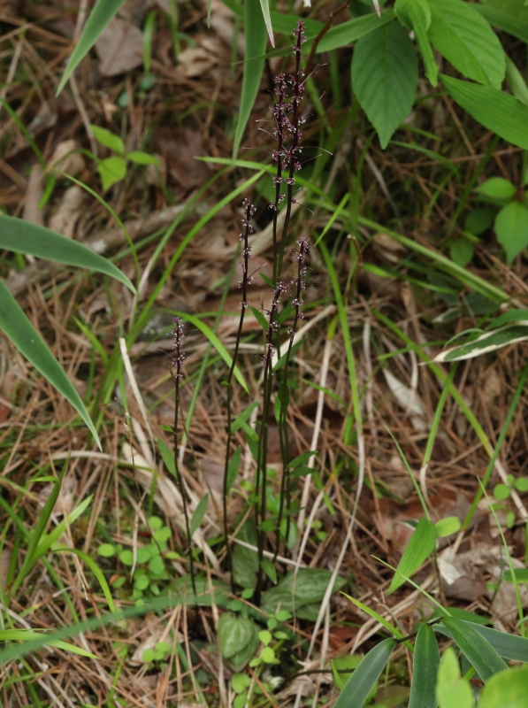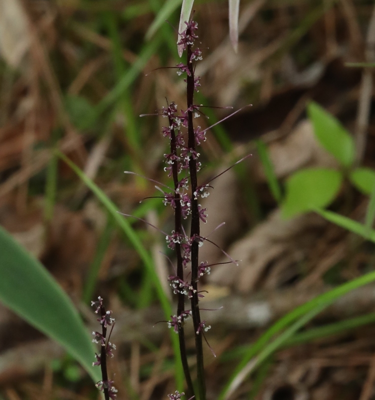 けれまでチャボシライトソウは渓流沿いであったが、ここでは林縁である。この個体は花茎が紫色で花被片はあるが4個ではない。