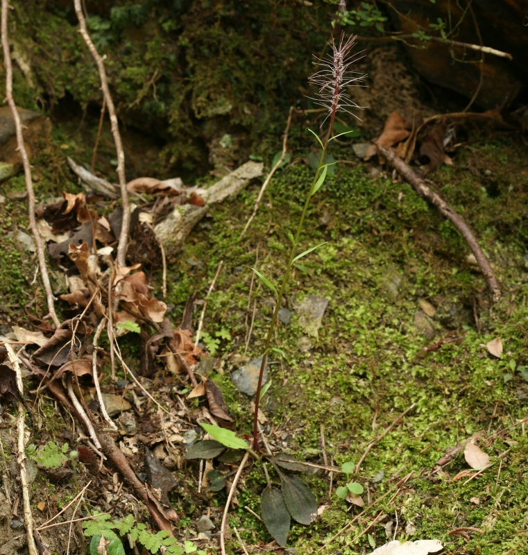 生育地域が変わると、個体にも変化が見られ、花序が全体に赤紫色を帯びている。生育環境は変わらず、渓流沿いの岸辺の半日蔭の岩壁である。