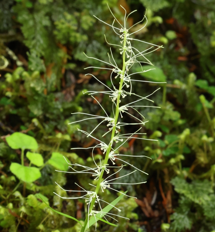 花は穂状花序につき、左右相称。上方の4花被片は緑白色で糸状、下方の2花被片は退化している。4花被片の伸びている向きは整然としてなく不規則で、糸状の花被片も折れ曲がったりしている。