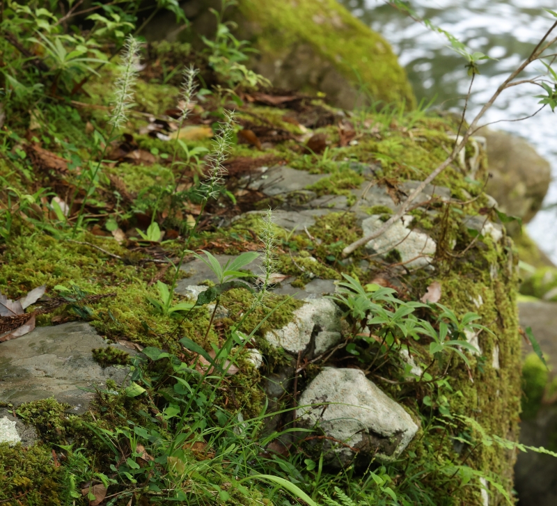渓流の水面から1mほどの岩棚のコケ類の中に根茎を下ろした個体。栄養分も少なく冠水するような場所で健気に自生している。