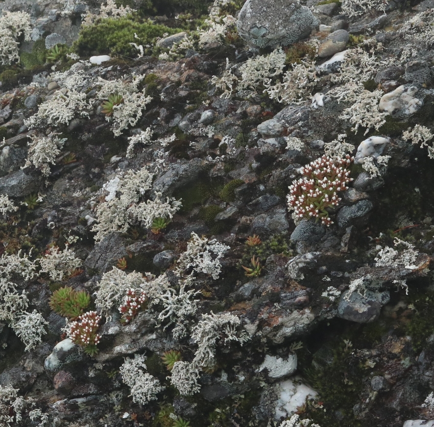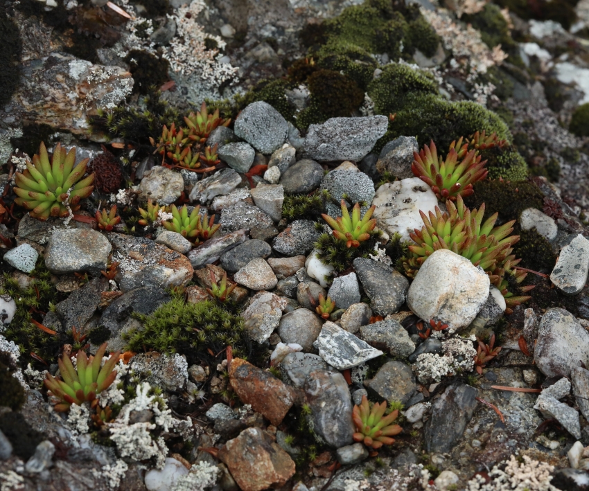 大小の礫が表面に出ており、チャボツメレンゲの開花株とロゼットの幼株が点在し、周辺には銀白色の地衣類と黄緑色のコケ類が見える。
