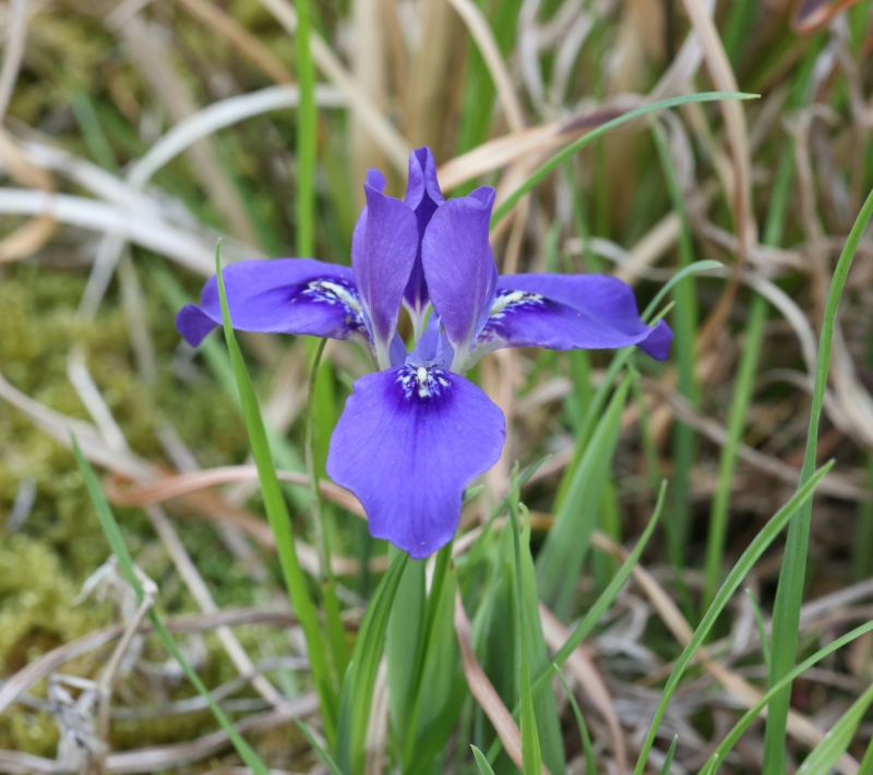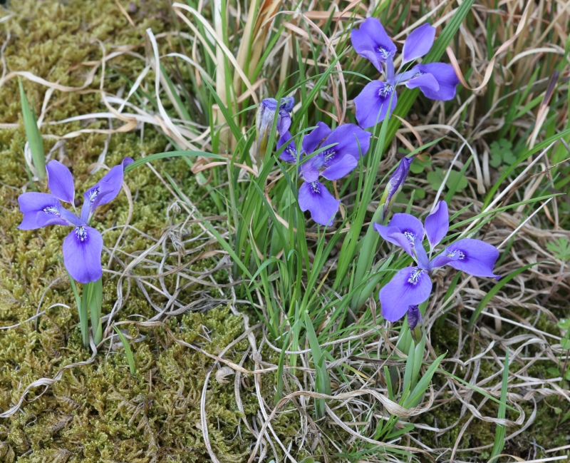 ハイゴケの中から花茎を出したエヒメアヤメ。エヒメアヤメの種子は褐色で直径3㎜ほどで、表面にエライヲソームとよばれるアリ誘引物質が付着しているため、アリに好まれ遠くまで散布される。アリ散布植物あるいは