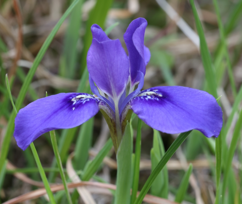 花茎は高さ5~15cmで、先に直径5cmほどの花を1個つける。花は青紫色で外花被片は狭倒卵形で、中央から基部にかけて黄色の筋が入る。内花被片はへら形で直立し、外花被片より小さい。