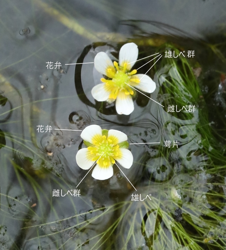 萼片は5個で緑色。花は沈水葉と対生して咲き、白色で中心部は黄色、花弁の基部には蜜腺があるが小さなへこみで退化的である。キンポウゲ科の特徴である多数の雄しべと多数の雌しべがある。