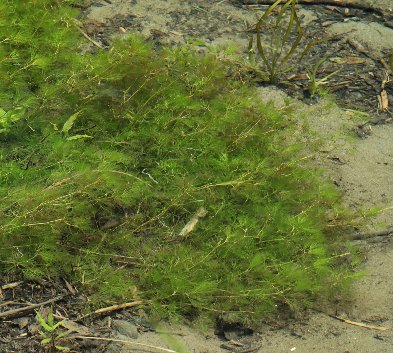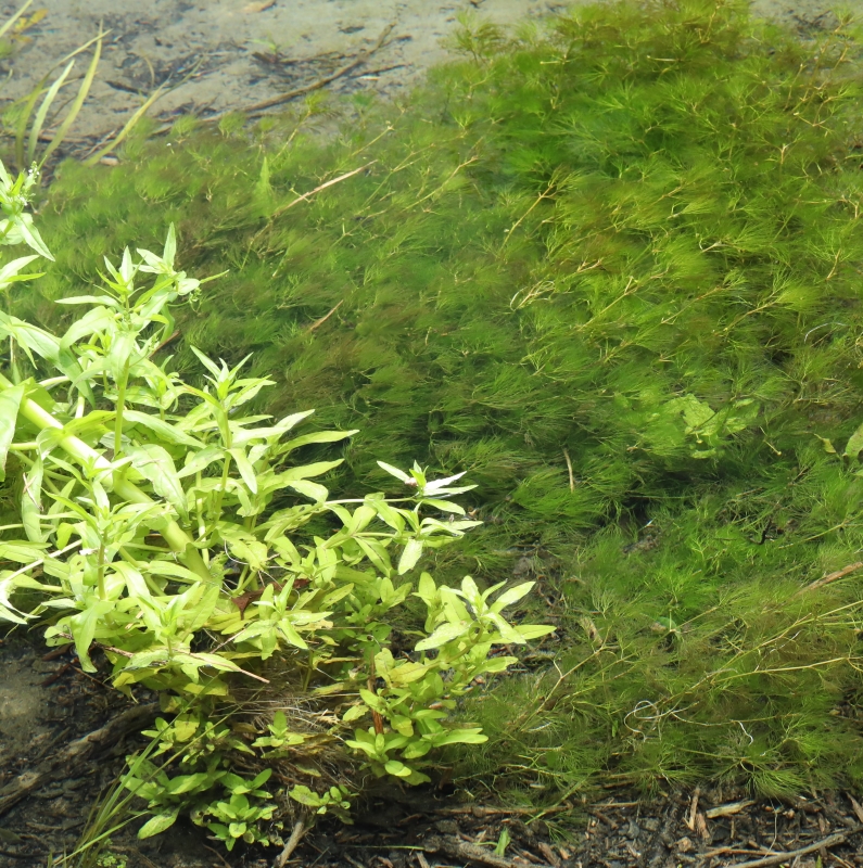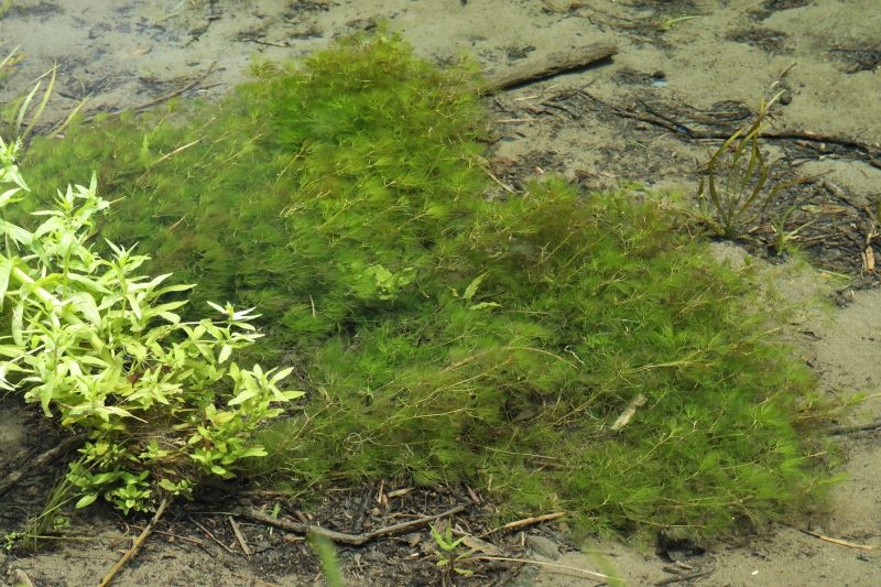 前画像の左側半分の近接画像。淡緑色の沈水葉の植物はカワジシャである。