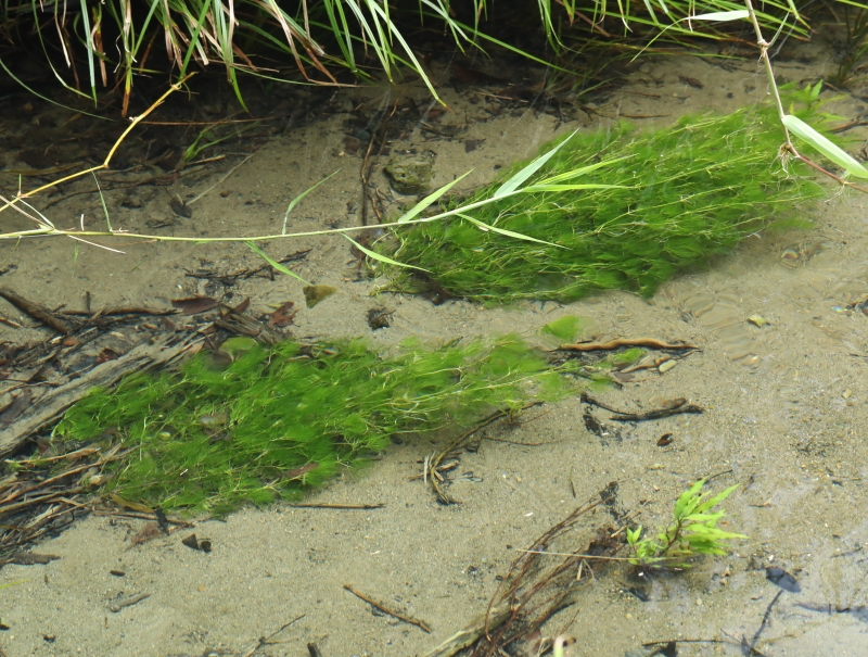 同じわんど内の水の流れのないよどんだ場所に流れ着いた個体。増水して、根こそぎ抜けこの場所に浮き漂っており、草体に傷みが少ないので、直ぐ近くに生えていたようである。