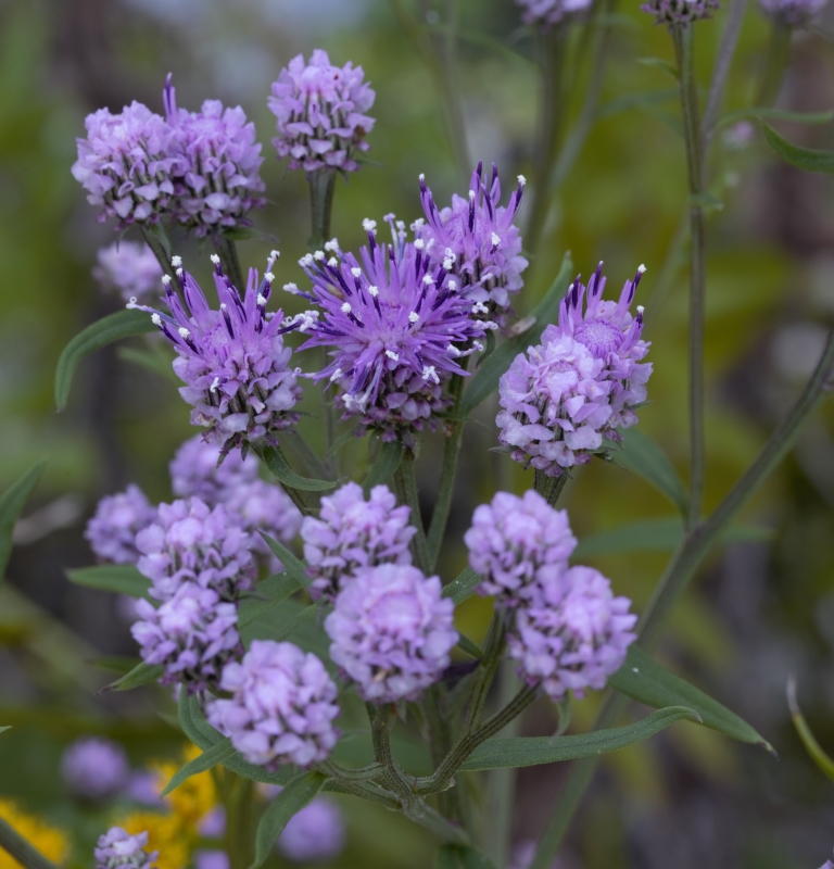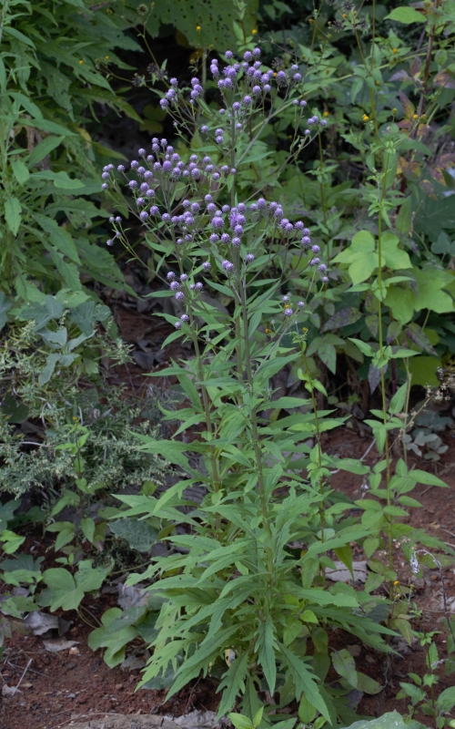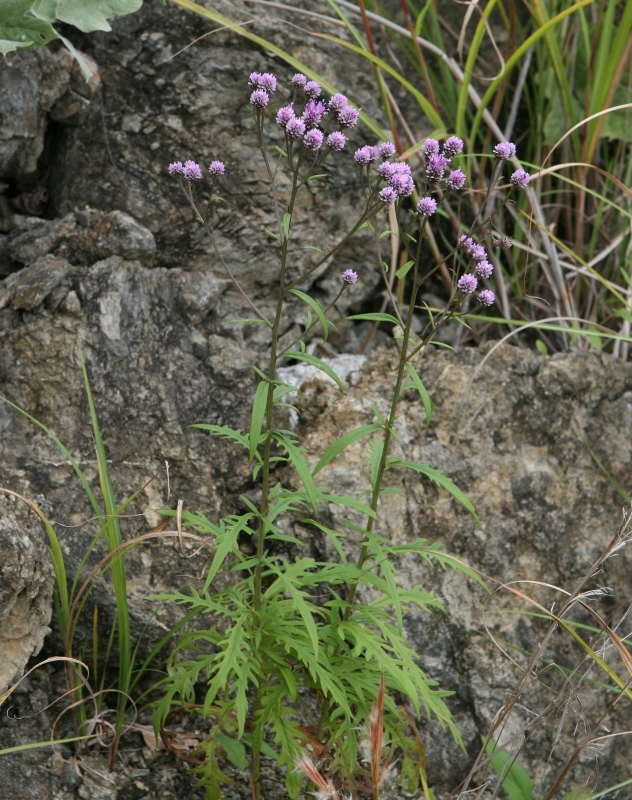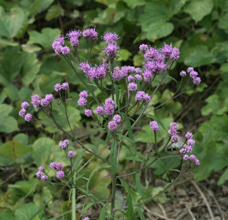 花は散房花序で、茎の上部が分枝して多数の紅紫色の頭花をつける。