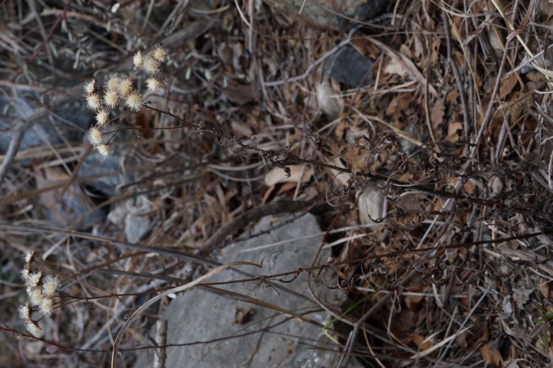 冬季の枯れて成熟した頭花で、冠毛を持った痩果を風で散布しようとしている。