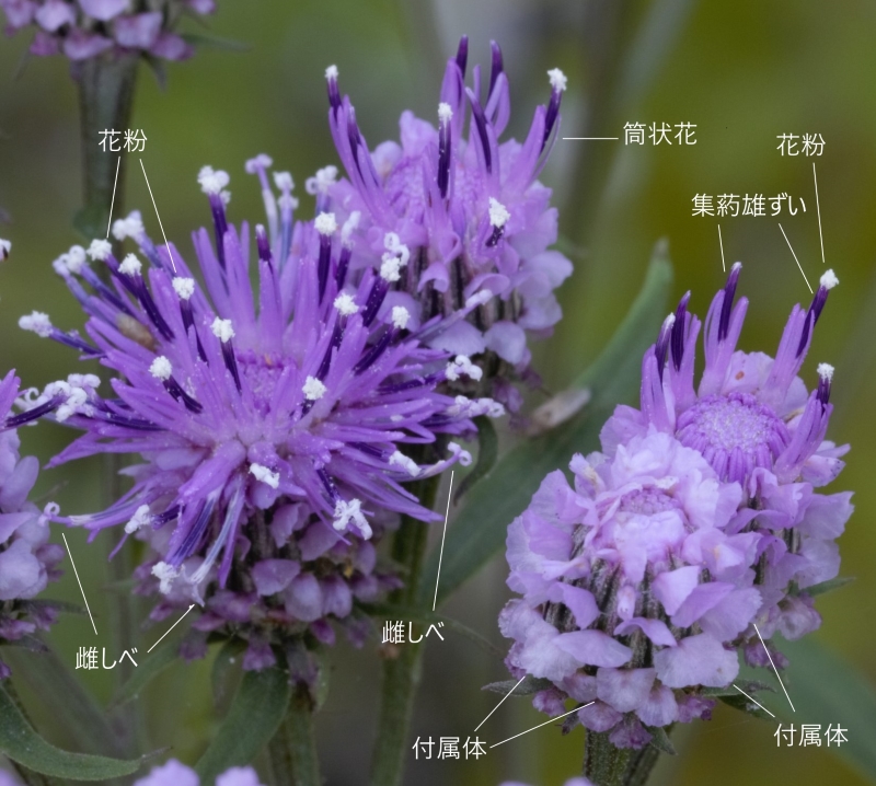 蕾の状態でも、淡紅紫色の付属体が花弁のように見えて、あたかも開花しているように見える。筒状花の構造はアザミとよく似ている。