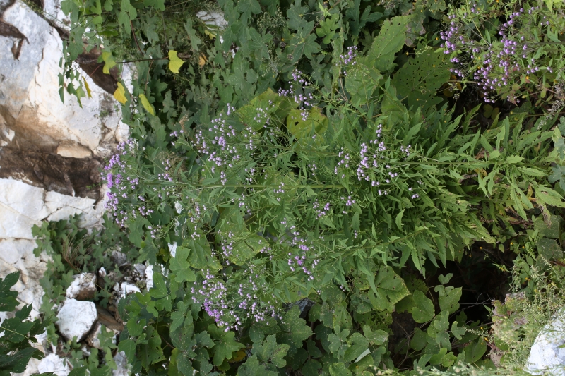 この自生地は日当たりの良い東南向きの石灰岩地の斜面で、海からも近い場所であり、散房花序の淡紅紫色の頭花は筒状花である。