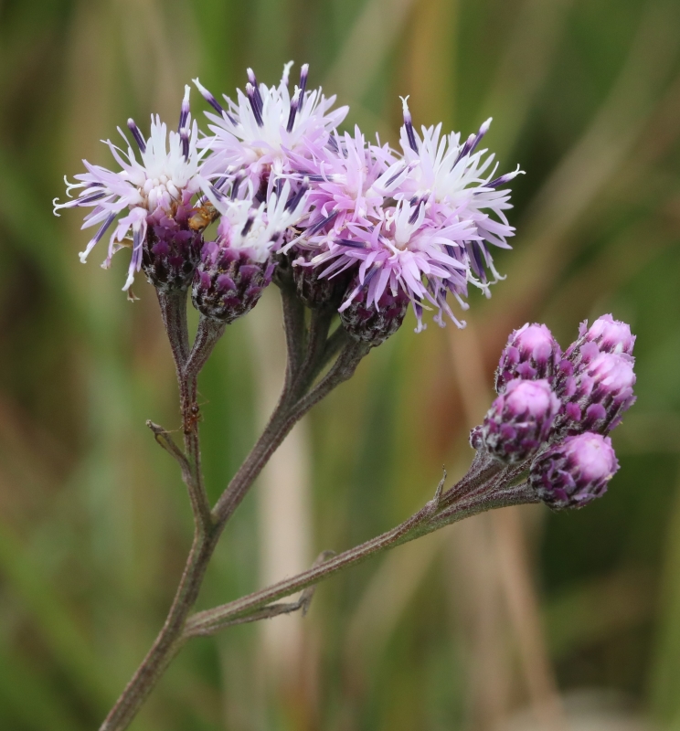 密集した頭花の近接画像。小花はすべて筒状花(両性花)で雄しべや雌しべを包む筒部の白色~紅紫色の花冠はふつう5裂し、咲き始めは紫色の円筒状の雄しべの中に