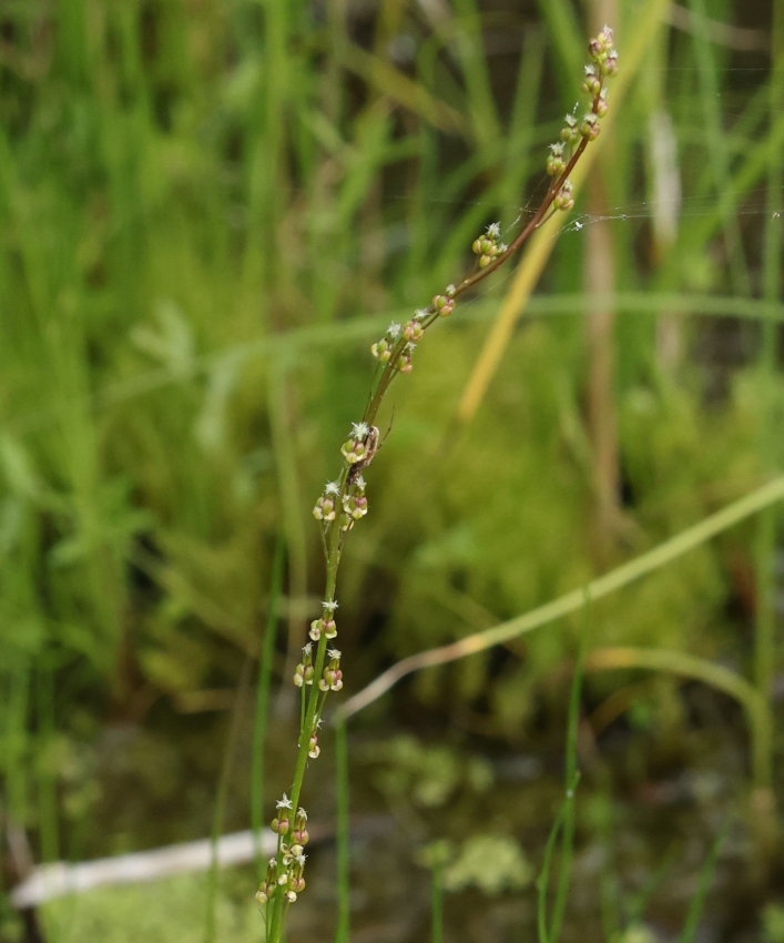 やや日陰に生育する個体。葉だけの株は多いが、花茎は1個しか見られない。日の当たる明るい湿地に群生する個体のほうが多数の花茎を出す傾向がある。