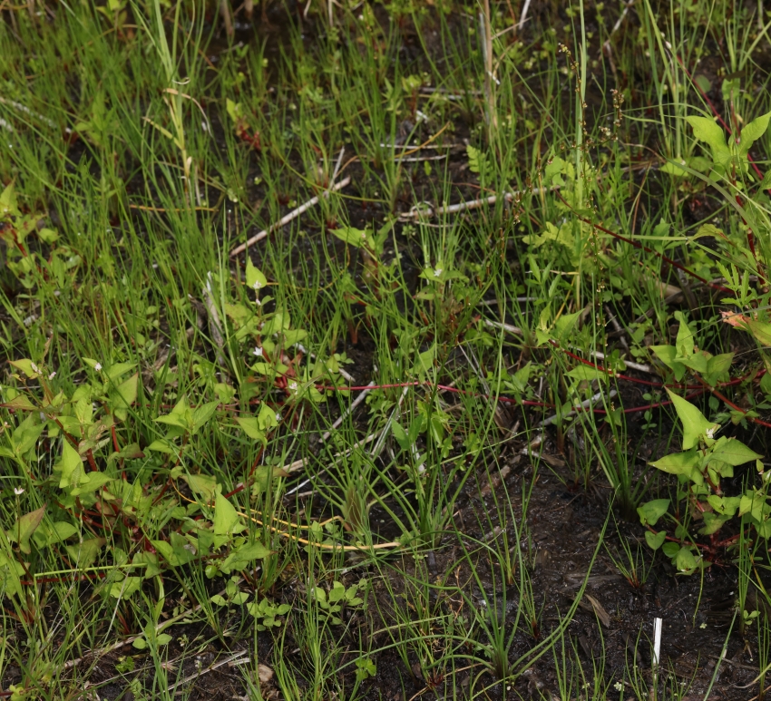 湿地の水辺から少し離れた少し乾いた場所に生育する個体。多数の個体が見られるが、水辺の湿地の個体にくらべて葉が全体に短い。