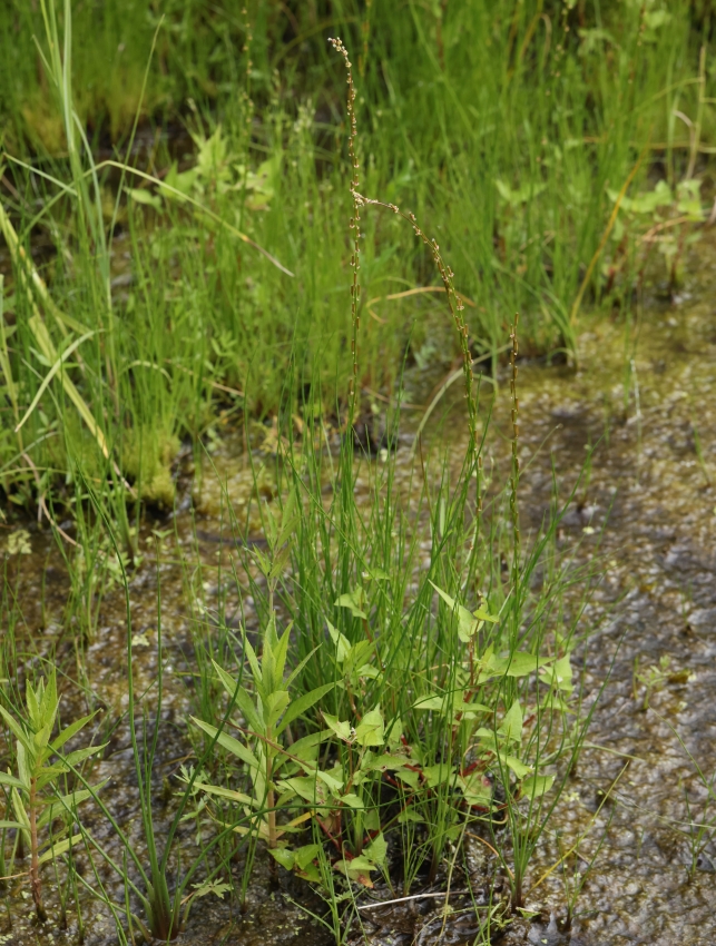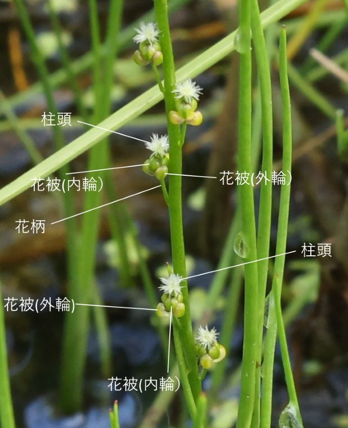 ・特徴 : 多年草。地下茎は細長く湿地の地中を横に伸びて走出枝を出す。葉は円柱形、長さ10~25cm、幅約1㎜。花茎は直立し高さ15~35cm、穂状の総状花序をつけ、花は両性で短い花柄につく。