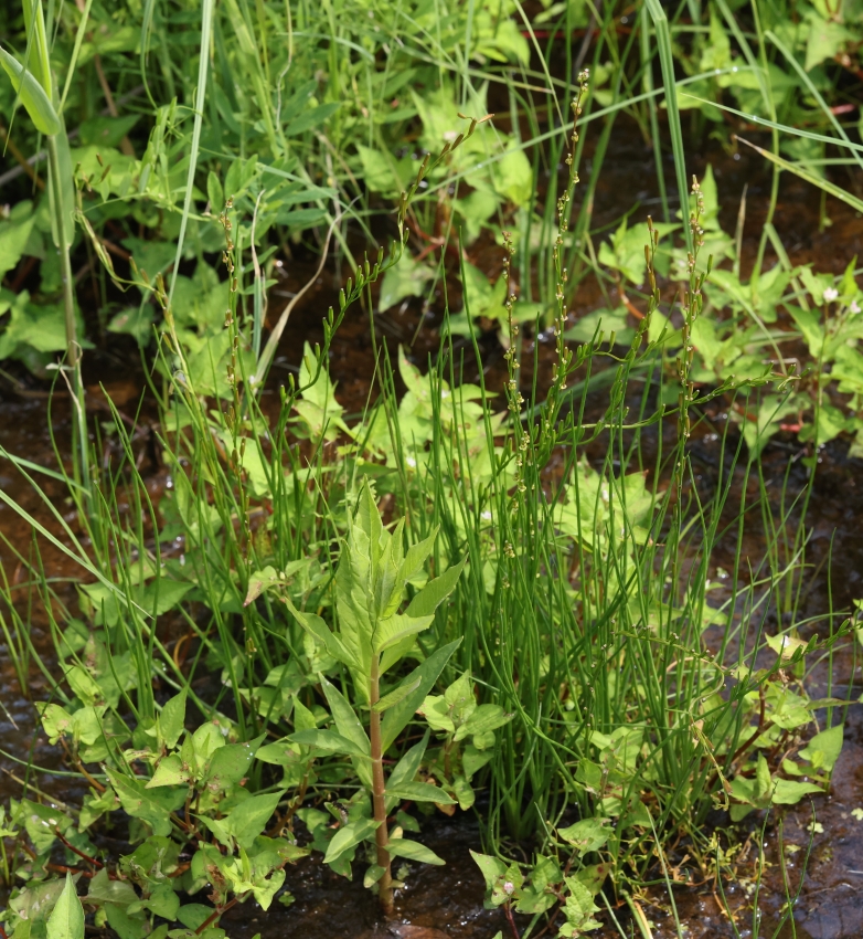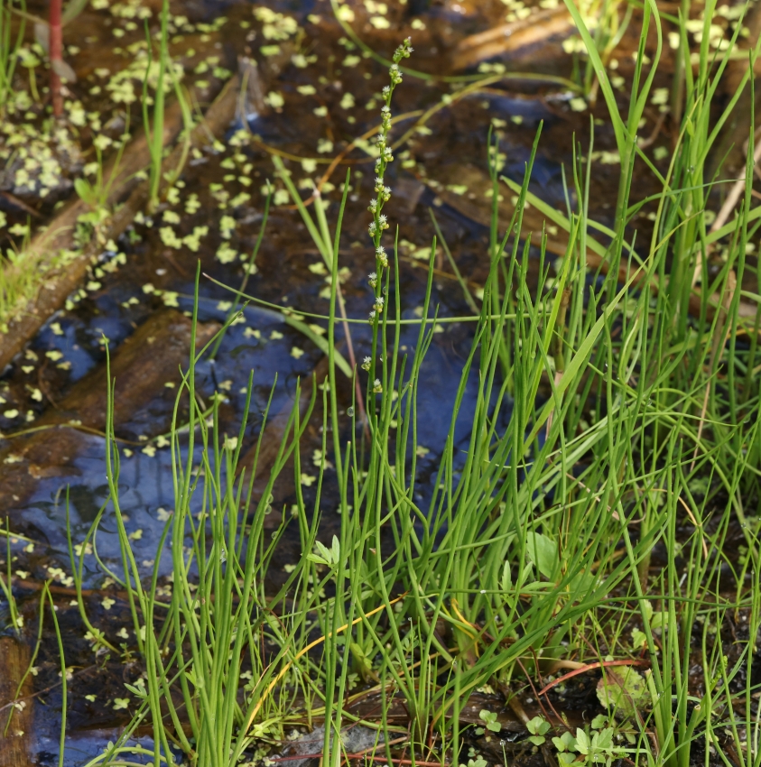 湿地の浅い水中の泥土中の根茎から花茎を1個伸ばした個体。葉は単葉で基部に集まってつき、立ち上がり円柱形である。この個体では花茎の長さは葉の2倍ほどあり、長い。
