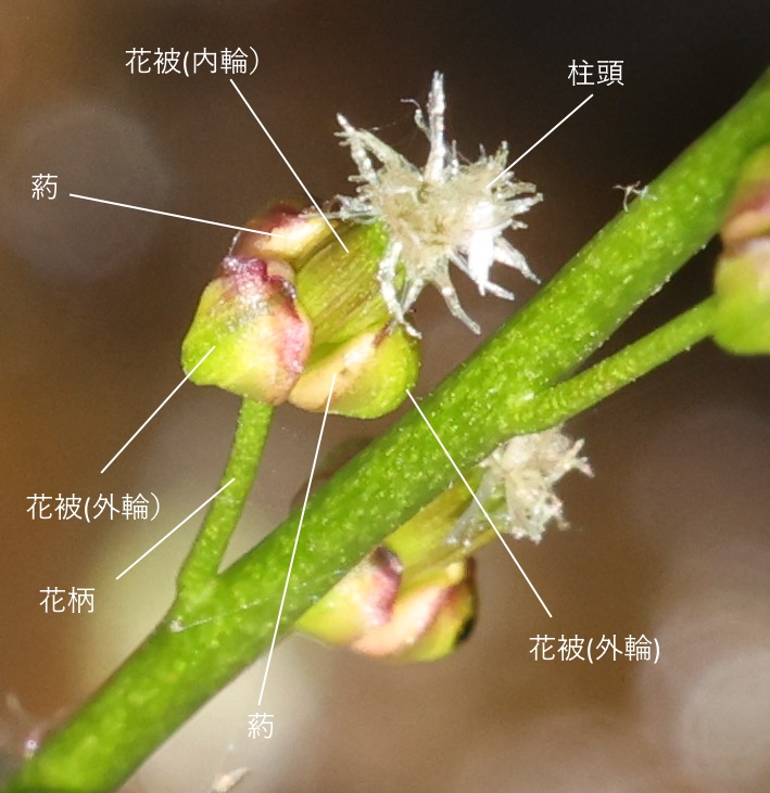 花被は黄緑色で貝殻形、外輪に3枚、内輪に3枚の6枚で、それぞれの花被に1個の雄しべを内側に抱く。これより外輪と内輪の合計と同じく雄しべは6個で、花糸はなく葯は外向きにつく。雌しべの心皮は6個で3個ずつが先端側と基部側に分かれてつき先端側の3個が稔性があり、基部の3個は不稔性で、花柱はなく、柱頭は羽毛状。果実は分離果で線形、長さ約8㎜、幅約1.2㎜。