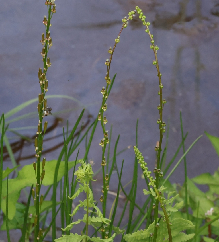 ヒメシダ、ミゾソバなど湿地を好む植物と生育している。6個の花茎が見える。