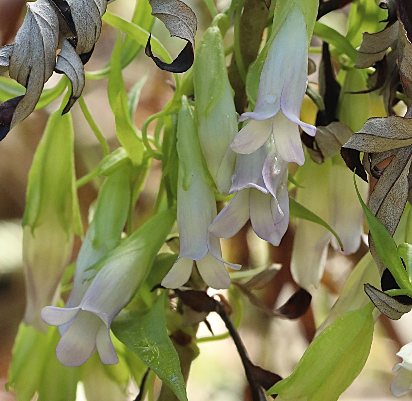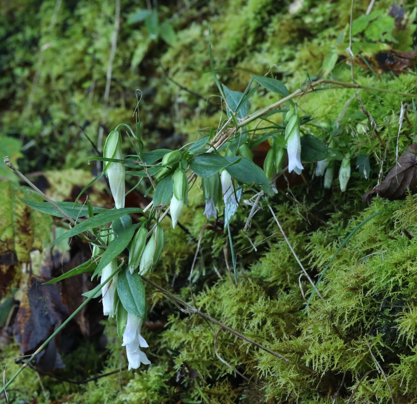 細いツルに狭い貧弱な葉をつけた草体に異様なほど多数の花を乱雑に無秩序に下垂させて咲かせている姿は不思議であるが、何か進化の過程でホソバノツルリンドウが多数の蒴果の種子を少しでも高い所から遠くにばら撒こうという生存戦略に起因するのであろうか。液果のツルリンドウとの対比もおもしろい。