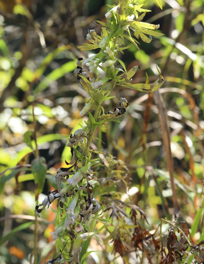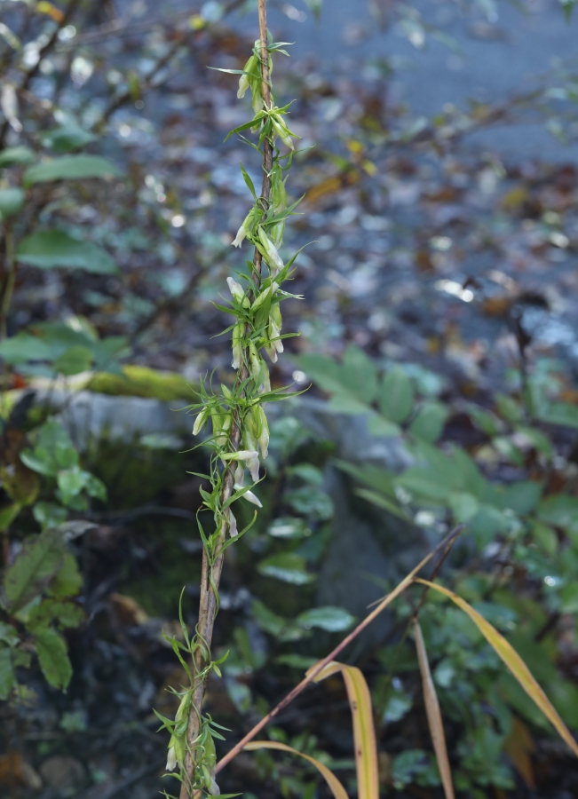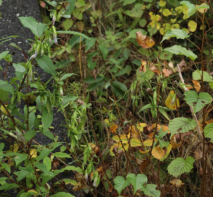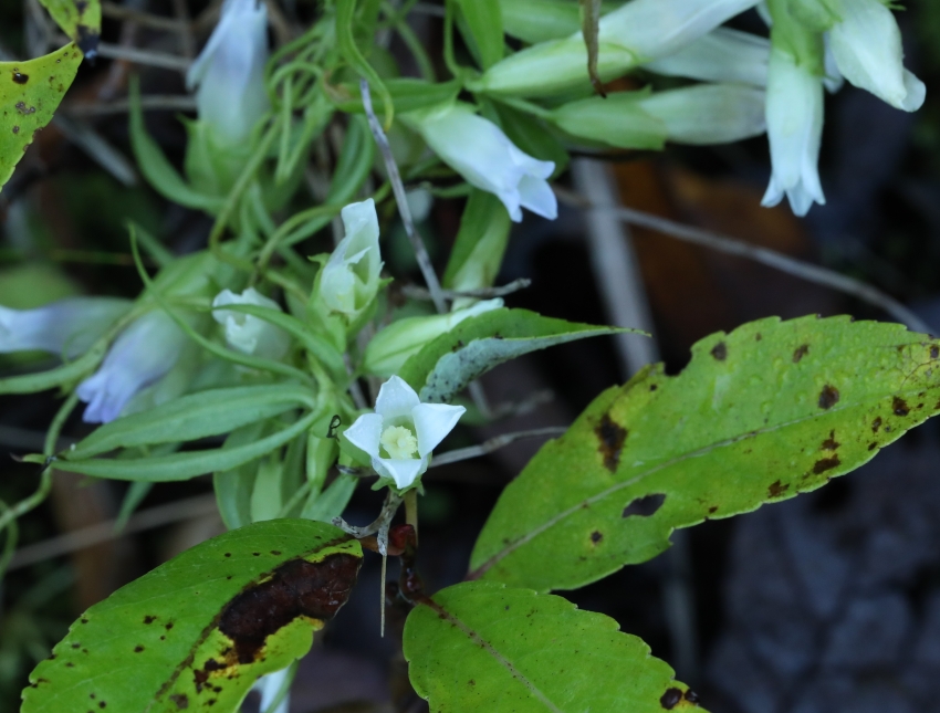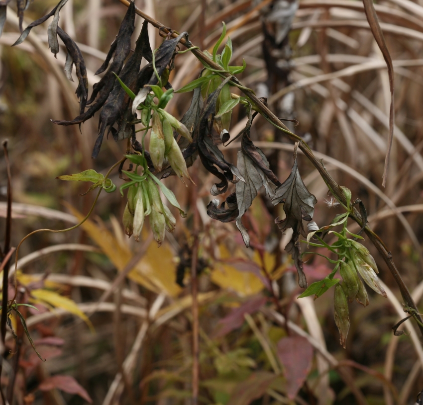 標高1200mほどの場所に生育している個体で、秋の訪れが早く周囲のススキやホソバノツルリンドウが巻き付いているヨモギも枯れている。花冠が開かずに結実している花もあるようで、全体に秋のわびしさを感じる。