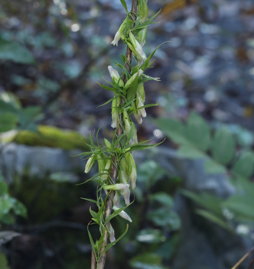 発芽するためには菌根菌の好む土壌が必須のホソバノツルリンドウは発芽確立を上げるため高所から多数の種子散布の戦略をとったため、ツル状になり多数の蒴果をつけるように進化してきたように見える。