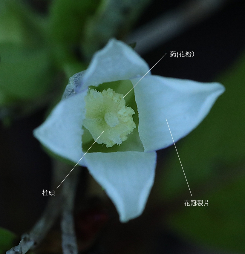 花は葉腋にふつう1個つき、萼筒は長さ15~20㎜、4条の翼があり、裂片は広線形で長さ3~5㎜。花冠は白色で淡紫色を帯び、筒状で長さ30~35㎜、先は4裂し、裂片は長楕円形で、