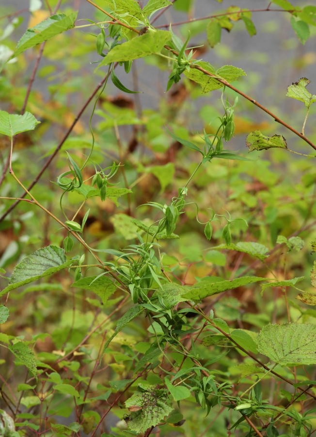 ホソバノツルリンドウは巻きひげなどはなく茎だけで巻き付き、画像では左巻である。