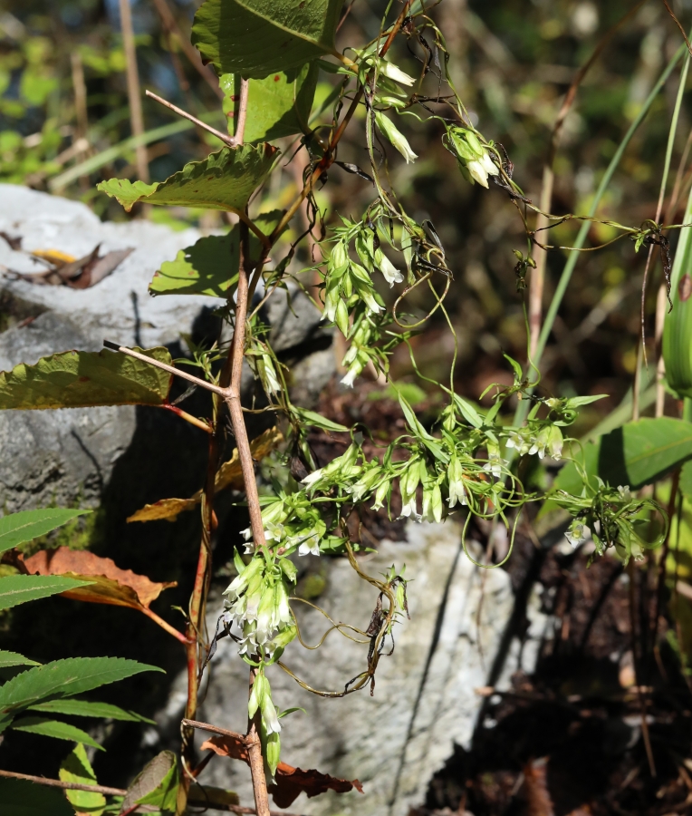 標高1300mほどの石灰岩地の林縁の明るい風通しの良い開けた場所でススキやヨモギなどが周辺に見られた。ツルにあたる茎は細く、葉は名前通りに葉幅が狭く細いのに対して、花は大きくその数も異様に見えるほど多い。