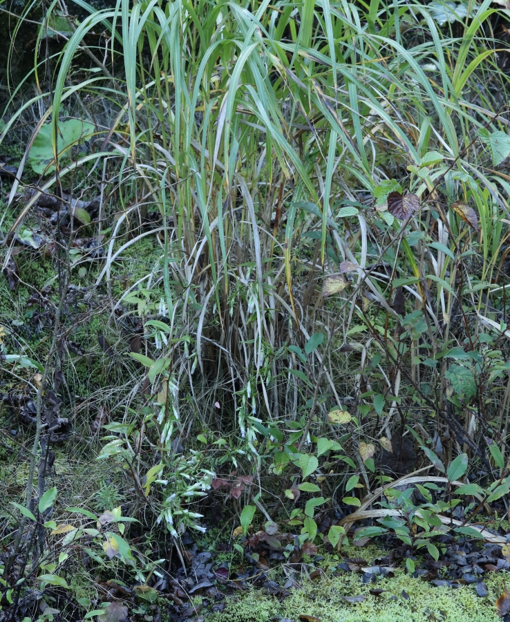 やや日陰の明るい場所のススキの株元の土壌に根茎を下ろし茎を伸ばしている個体。ススキやヨモギはホソバノツルリンドウの周辺でよく見かけ、土壌中の菌根菌との関連もありそうである。