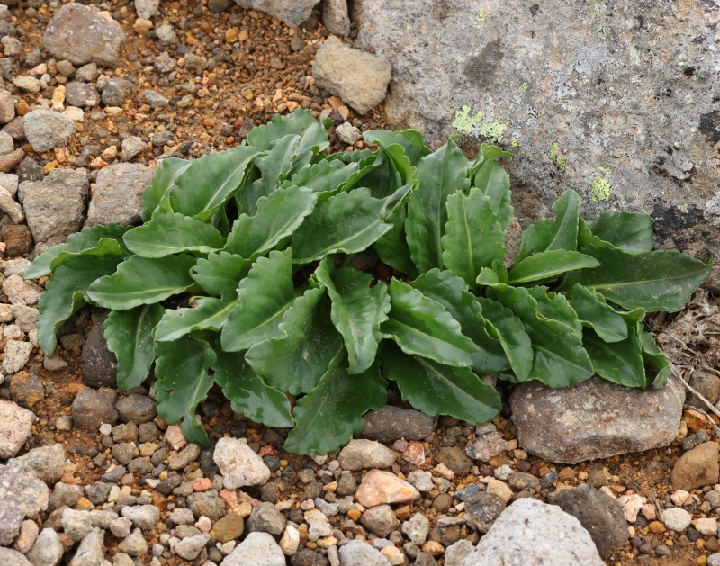 根出葉は長さ7~13cmの狭卵形~長楕円状披針形で厚くて光沢がある。長い葉柄があり、縁は低い鋸歯がある。この株は今年は花茎を出さないが、