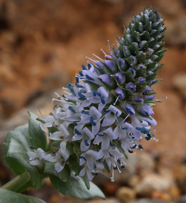 咲き始めであるため青紫色の花序が瑞々しく、太い花茎と光沢のある濃緑色の肉質の葉の調和が印象的である。