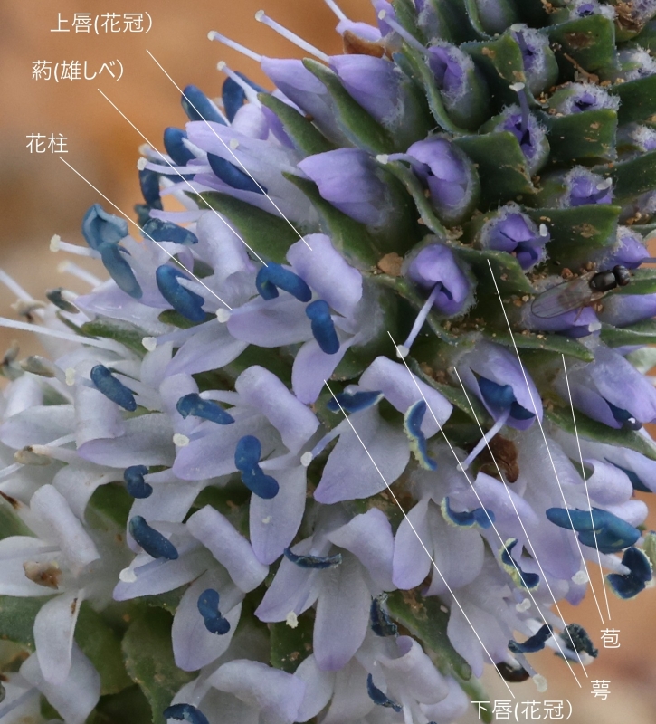 太い花茎を伸ばし、先端に多くの花が密生する穂状花序をつくる。苞は楕円形で先がとがる。萼は膜質で背面は盛り上がった低い円形。花冠は青紫色で筒状唇形、上唇と下唇からなり下唇は深く2裂する。