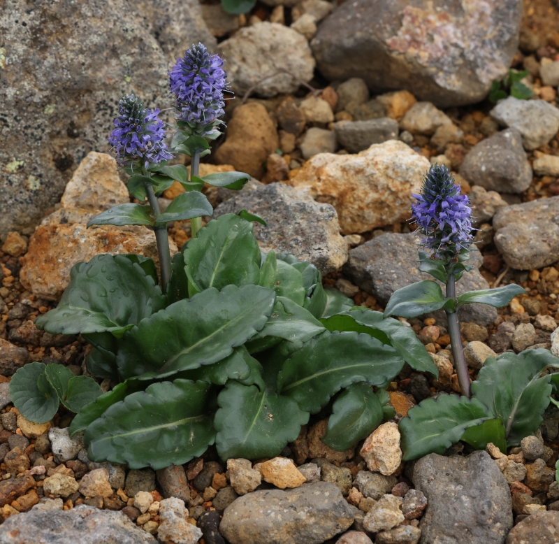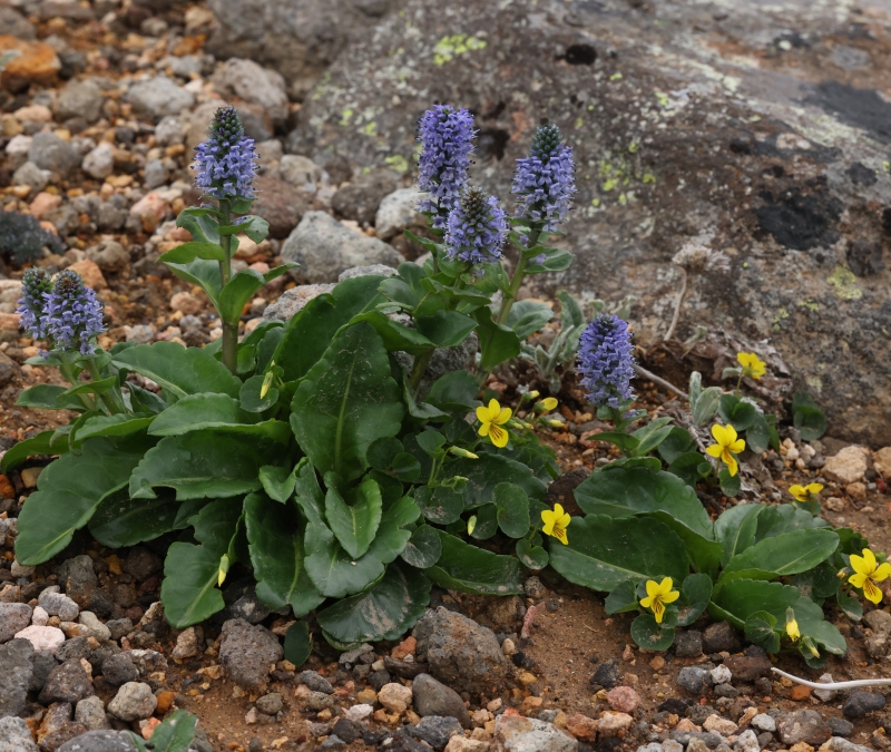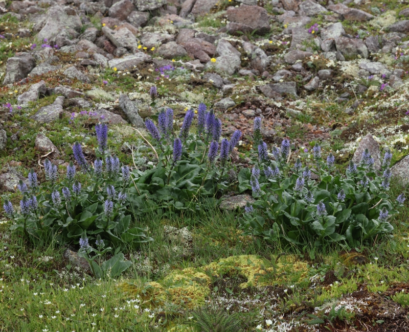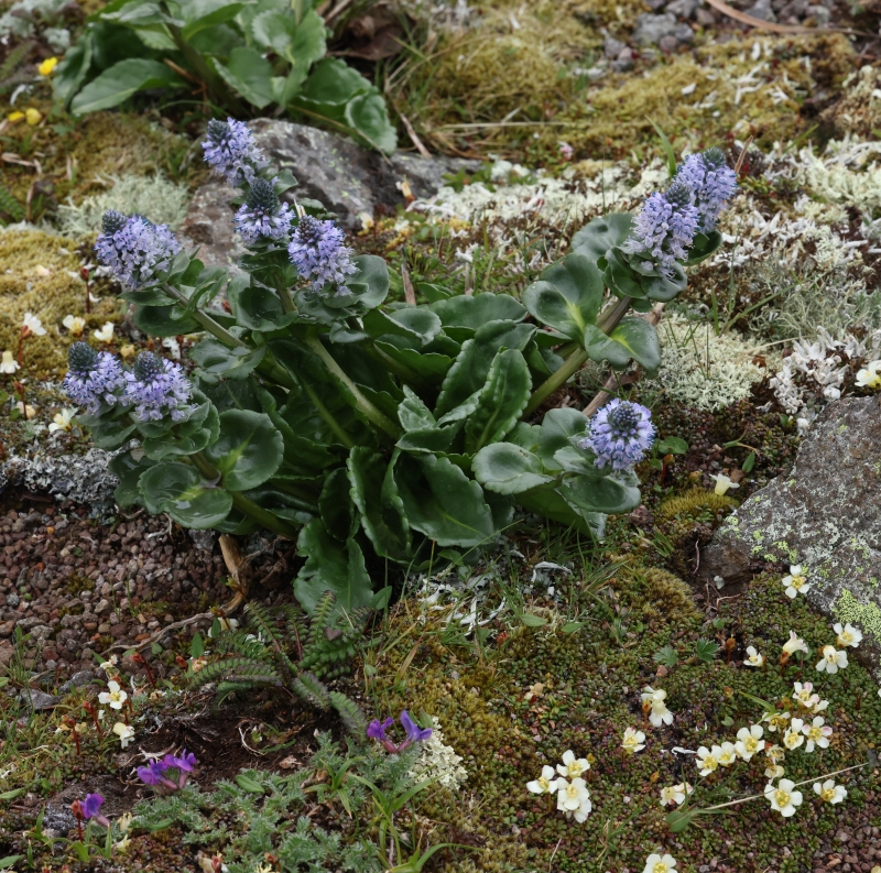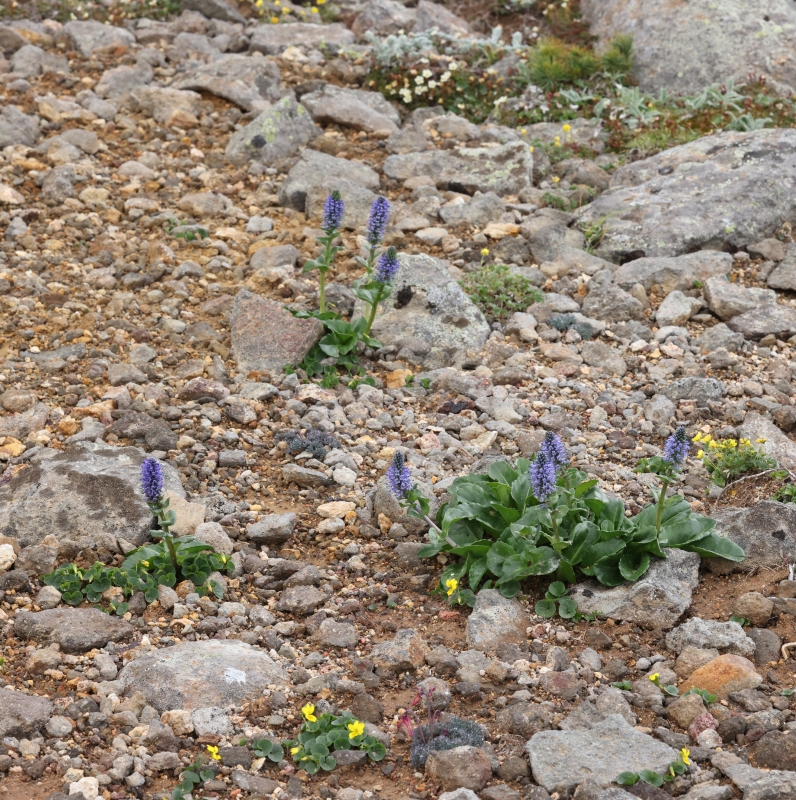 ホソバウルップソウが3株点在しているが、周辺には下方にコマクサ、エゾタカネスミレ、右方にメアカンキンバイ、上方にイワウメが見られる。
