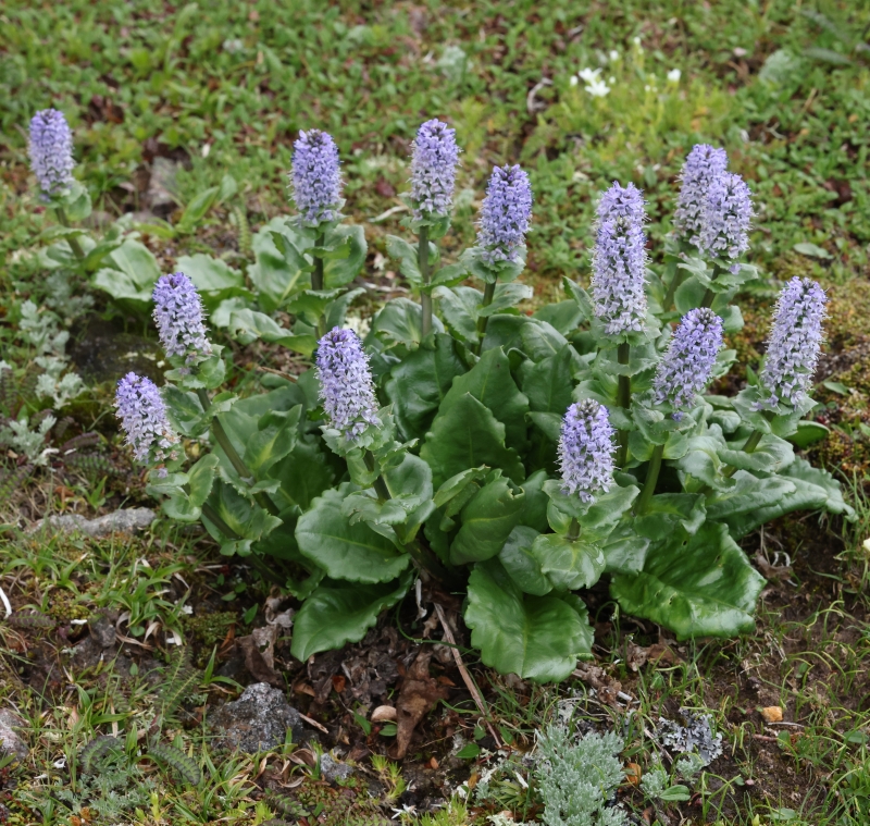 12個の花茎を伸ばした個体。10個をこえる多数の青紫色の花序は光沢のある瑞々しい葉をともなって豪華である。