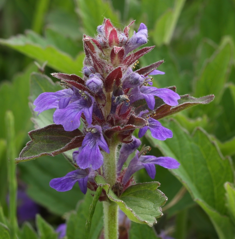 花は花穂状の輪散花序を茎頂につける。青紫色の花冠や赤花色の上部の葉が鮮やかである。