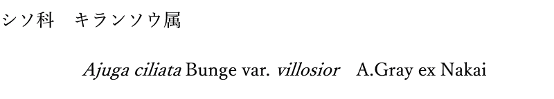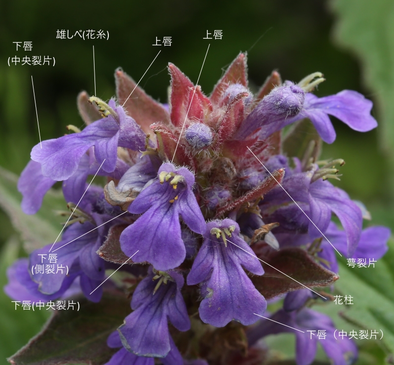 花は唇形花で、花冠は青紫色で長さ約10㎜の筒部があり、上唇は小さく2裂し、下唇は大きく3裂して開出する。