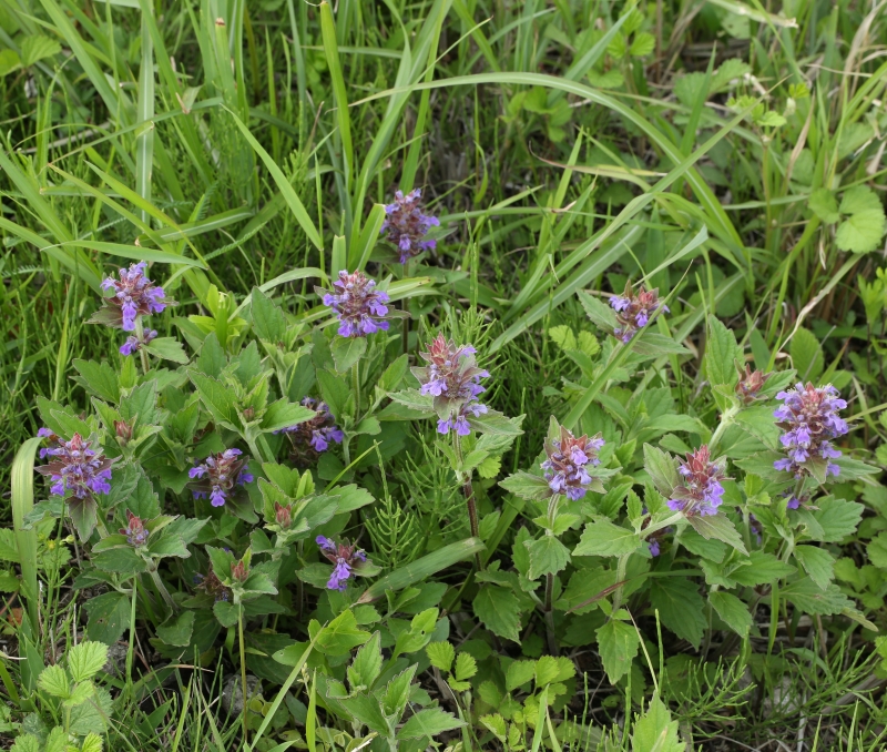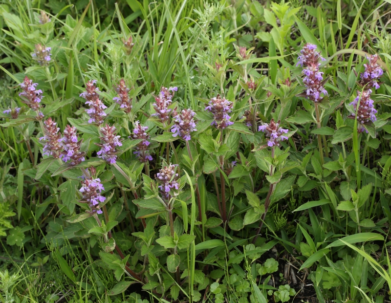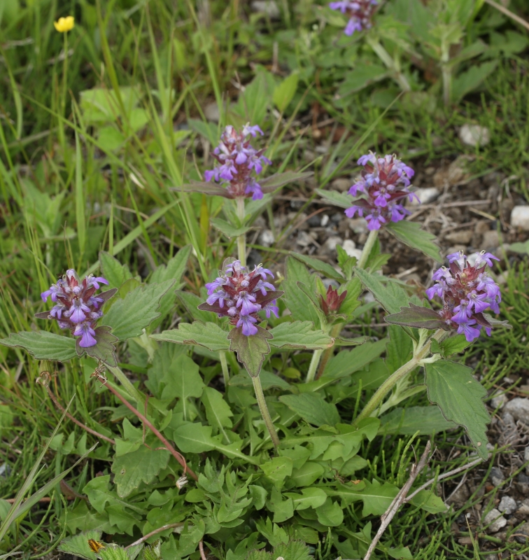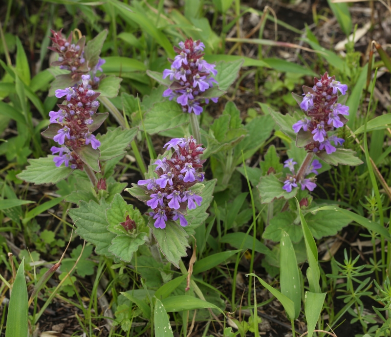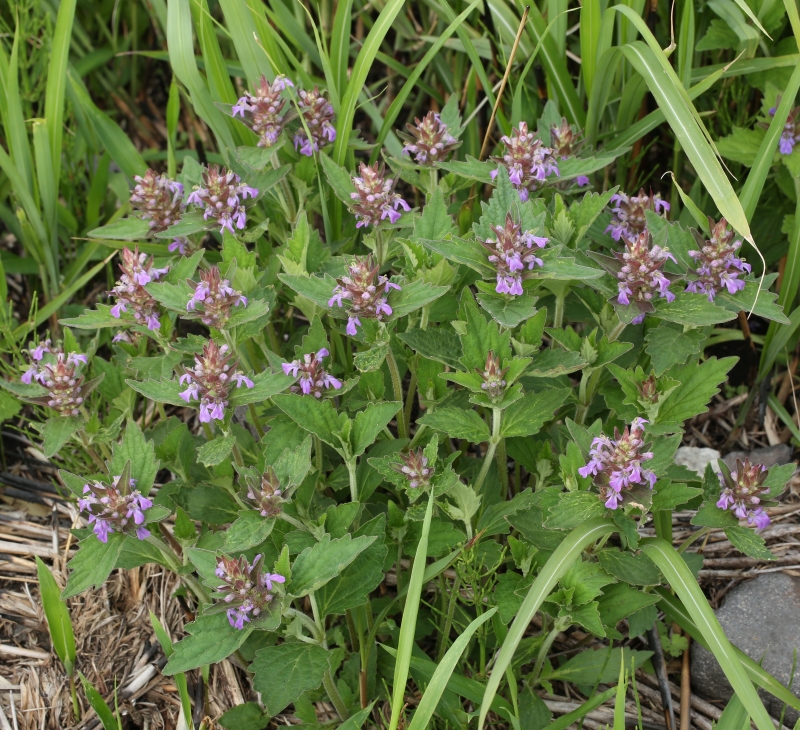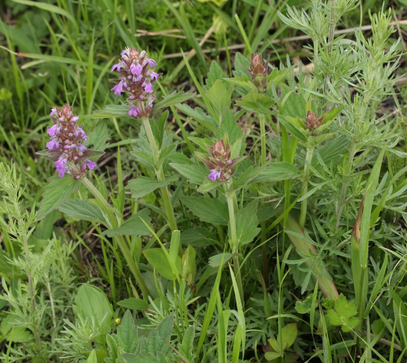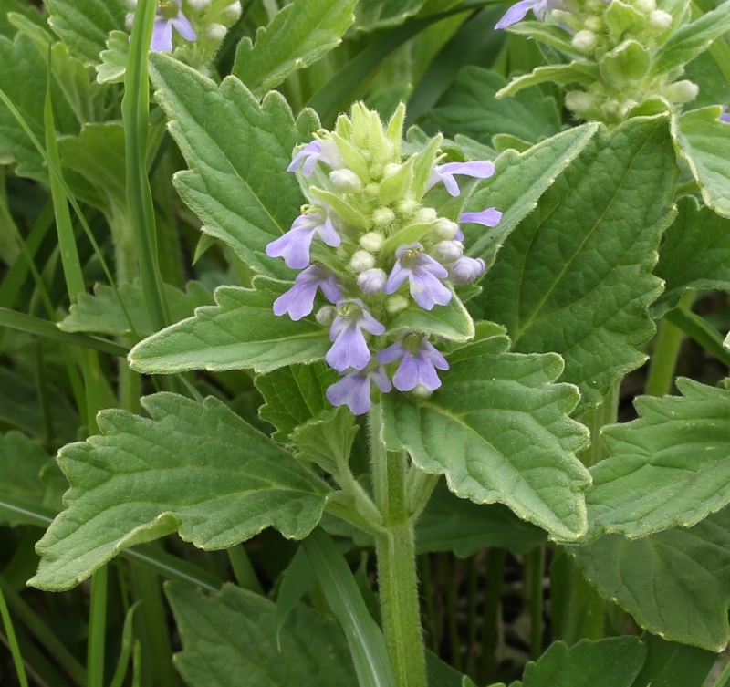 先はとがり縁には不規則な粗い鋸歯があり両面有毛である。上部の葉は狭卵形で鈍頭、苞とともに赤紫色を帯びることが多い。花は花穂状の輪散花序を茎頂につける。