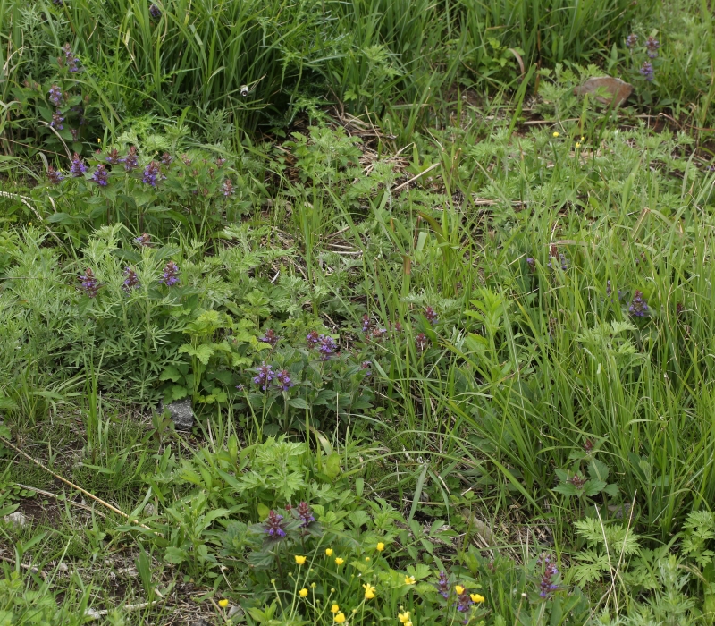 開けた草地に小さい株を含めて10株ほど点在している。ススキ、ヨモギ、アザミの仲間、ウマノアシガタなどが傍らにみられる。