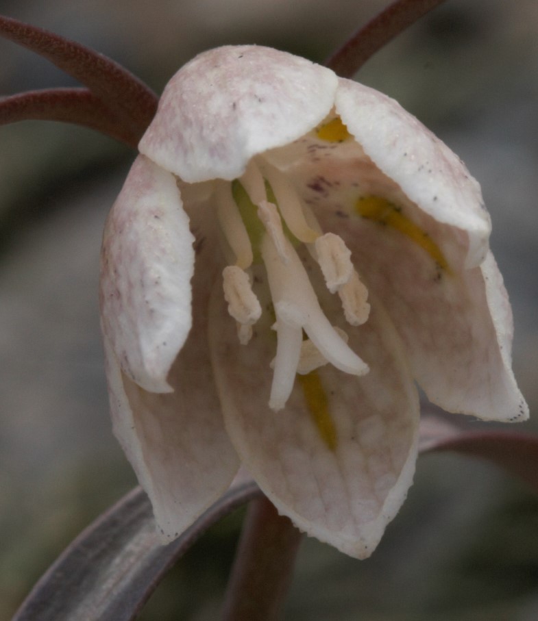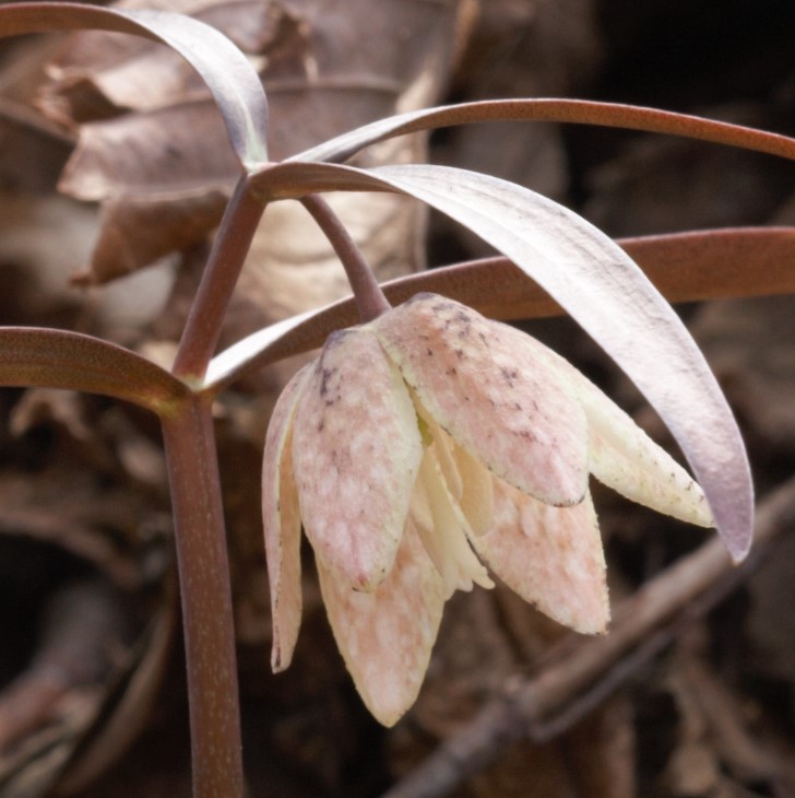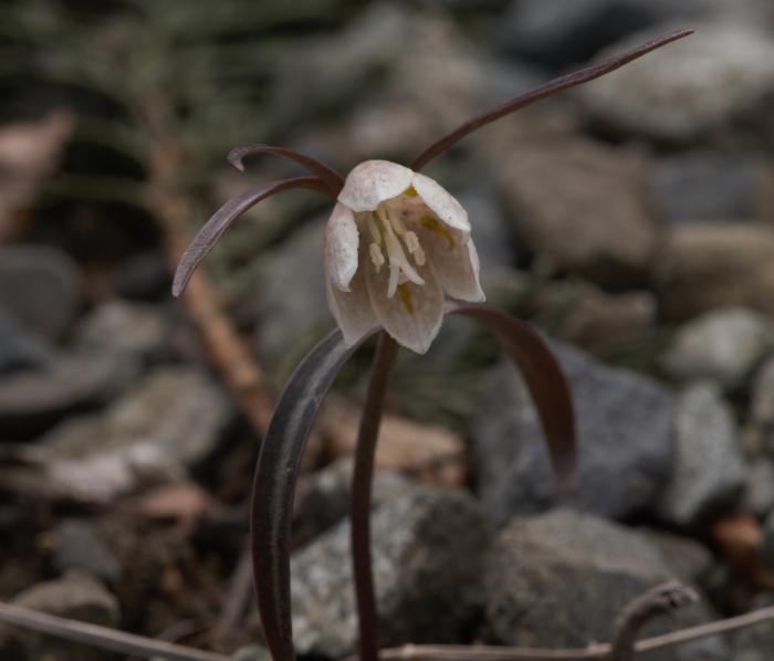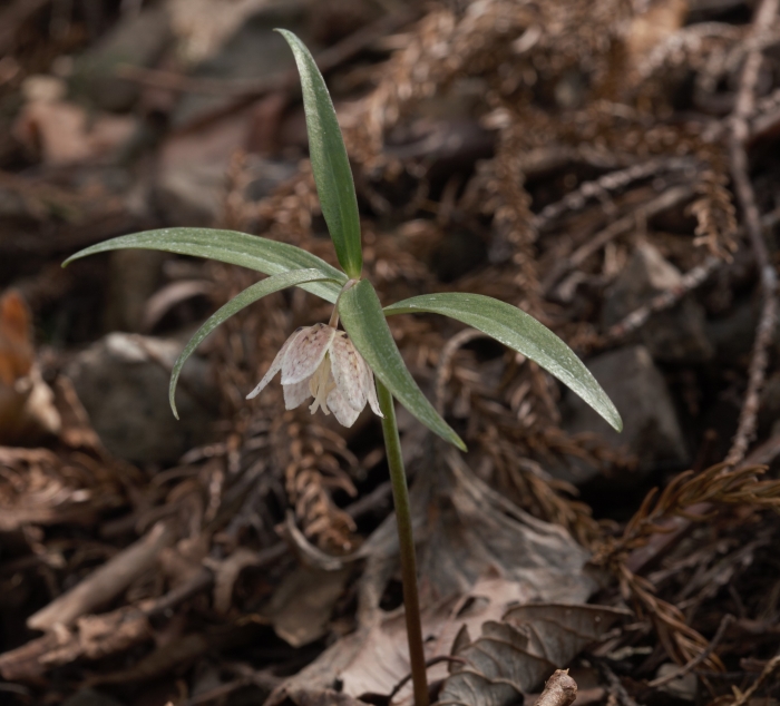 カイコバイモはその中でも、生育地域が限られた希少な植物であるが、この撮影地でも生育エリアは狭く個体数も少なかった。花はイズモコバイモと同じく、花被片が大きく開くため優雅に感じる。