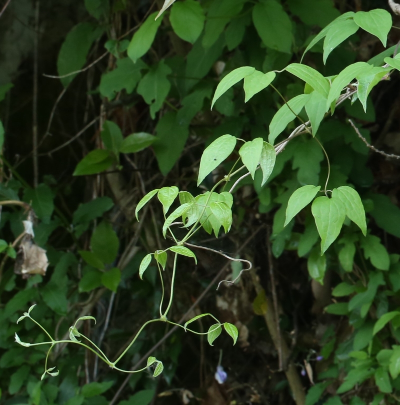 葉は3枚から5枚の卵形、全縁の小葉からなる羽状複葉で、対生である。長い 葉の柄により、周囲のものに巻きつき伸びる。