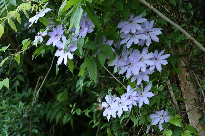 枝先に大きな花を1個つける。花弁のように見える萼片は普通8個あり、長さ6㎝、幅3cmほどで淡紫色か、白色がほとんどである。
