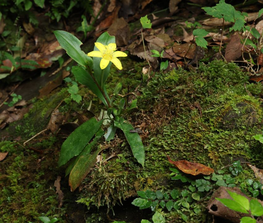 草丈(花茎)約20cmの3株。コケのにおおわれた崖地に根茎を下ろし、開花したばかりの花をつけている。虫による食害で傷んだ葉をつけている個体が多いが、この個体は
