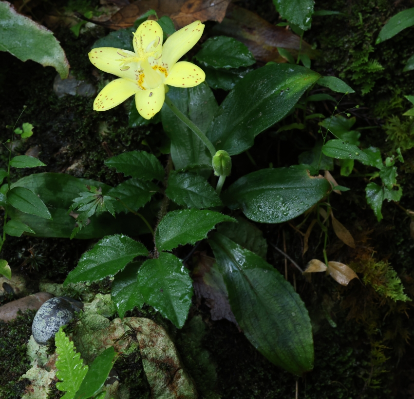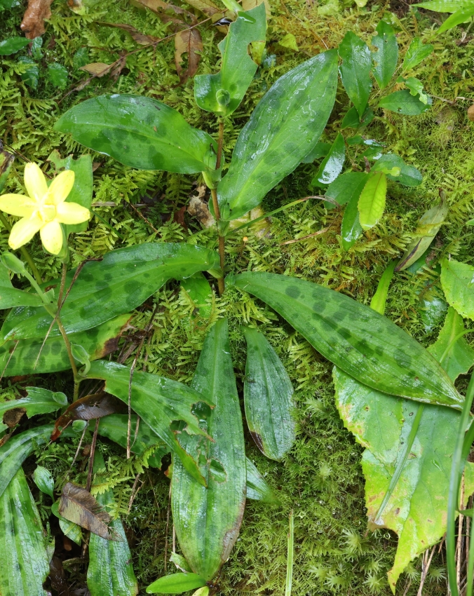 やや暗い支流の沢の岸辺の岩上のコケの中に根茎を下ろした個体。増水すれば水没するくらいの低い場所にある。キバナノホトトギスも条件があえば、繁殖力はたくましいようである。
