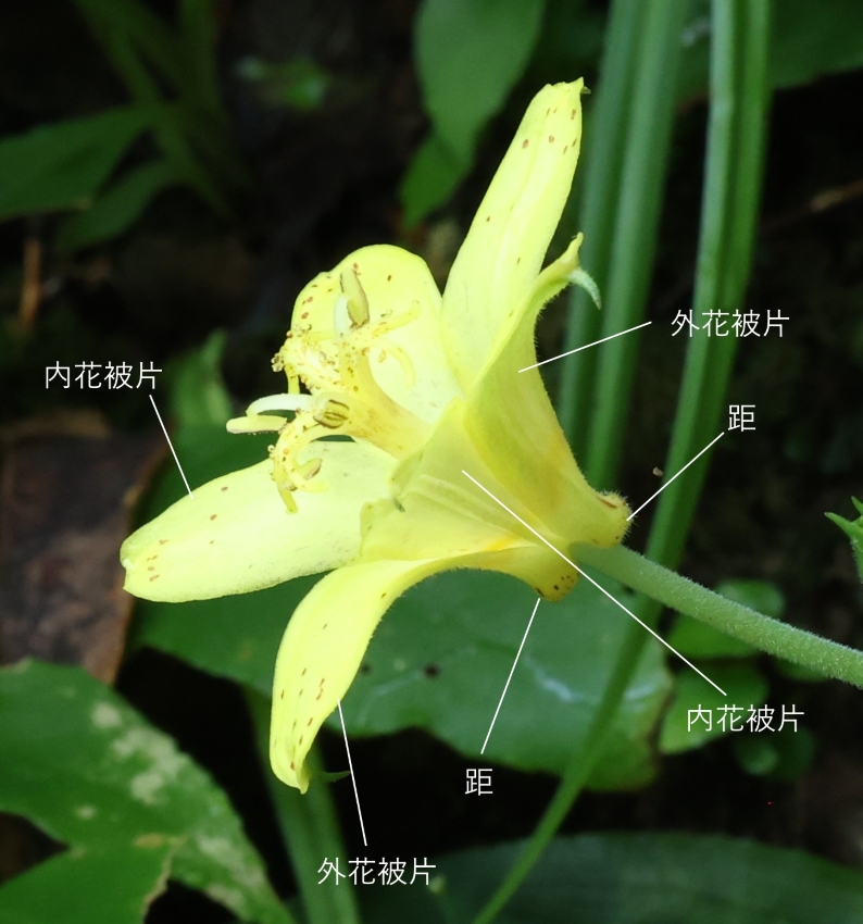 はるかに長く毛が密生する。雄しべは6個、葯は外向きで褐色である。花柱は3枝に分かれ、各枝はさらに2裂し平開する。花被片は6個あり、内外片ともにほとんど同形で、長さ約2.5cm、黄色の地に赤紫色の斑点がある。外花被片の基部に距がある。